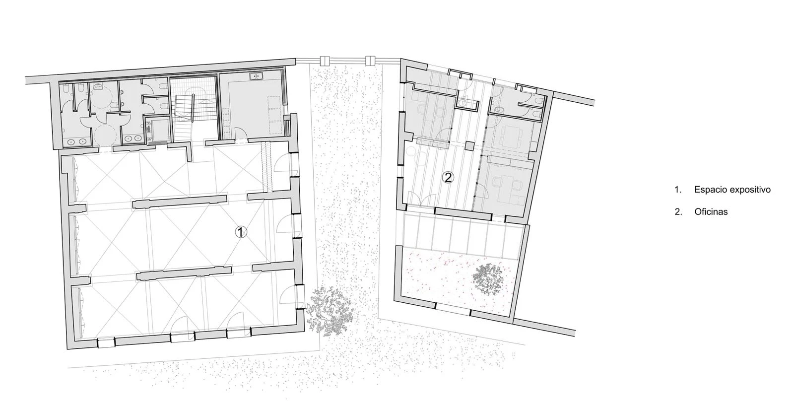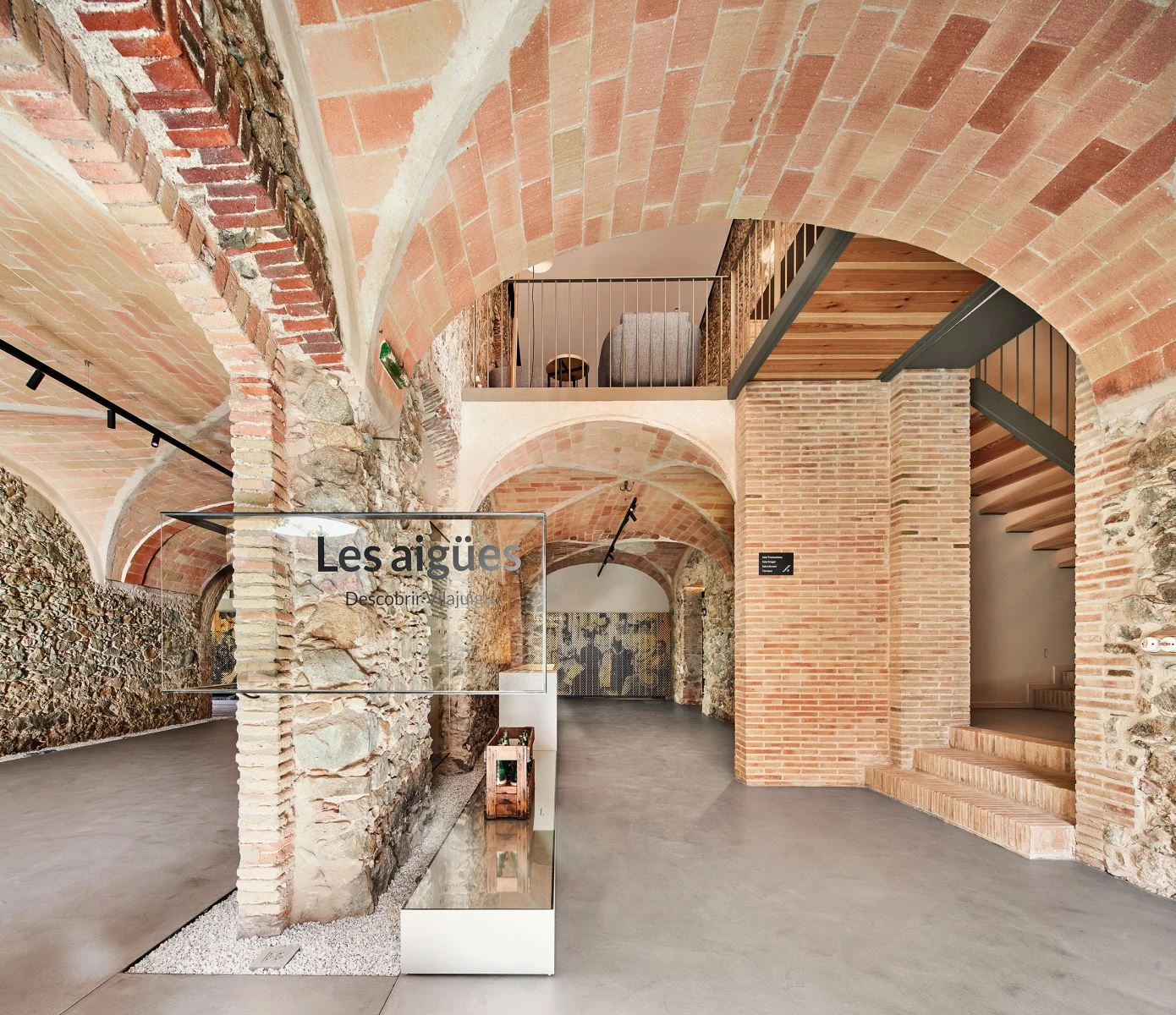 The brief called to revamp the factory facilities, wells, and warehouses, as well as to add new uses: training classrooms, exhibition spaces, and offices. One of the first design decisions was not to overbuild above grade, with the objective of preserving the atmosphere of the place, giving value to what time had gradually forgotten and which perhaps for this reason had remained: an old farmhouse from 1800, stalls, a modernist building... Elements that are simply cleaned and rearranged, recovering their value.