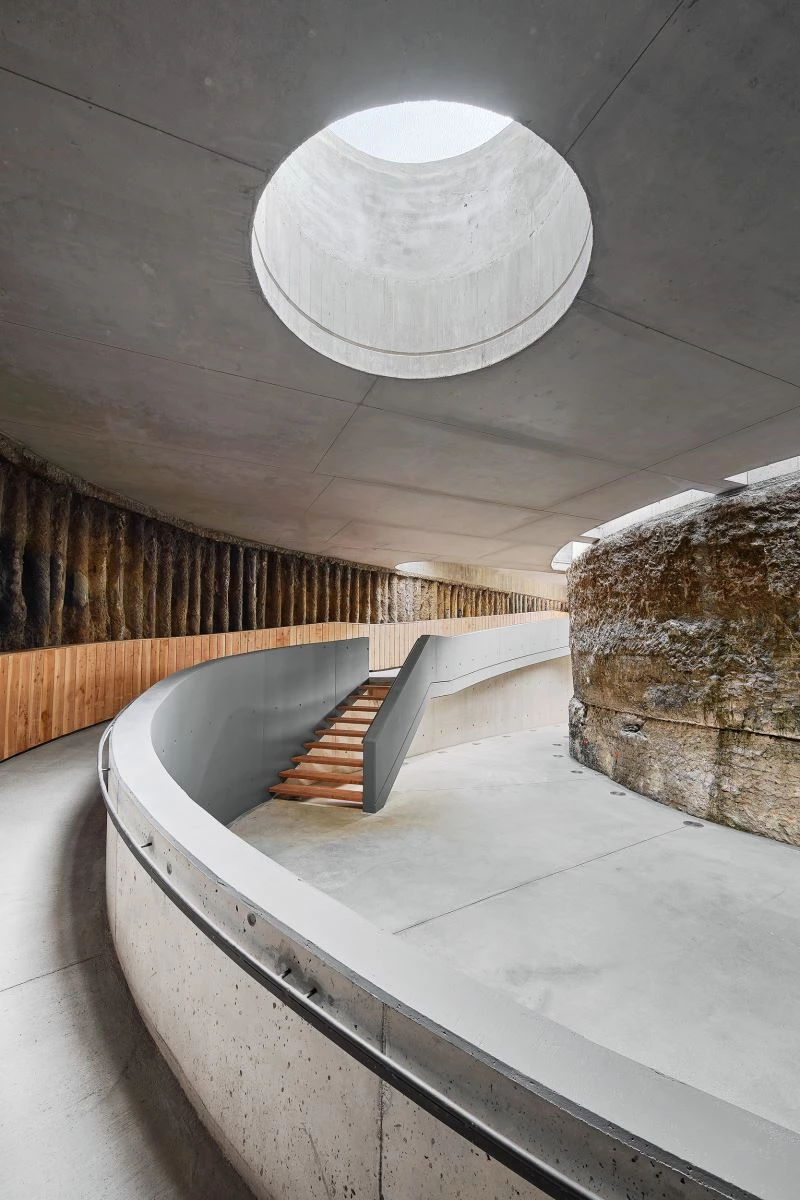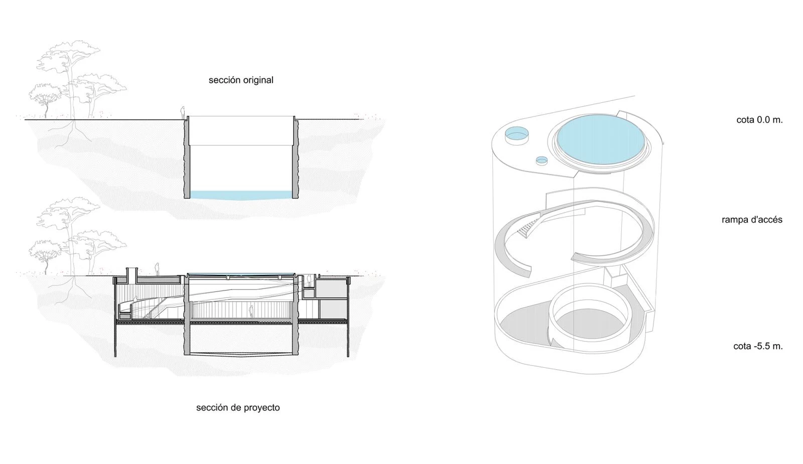 Underground, however, the intervention is very different. The project seeks proximity with water, the experience of entering the depth of the terrain, of descending, discovering water in its natural environment, of making the invisible visible.