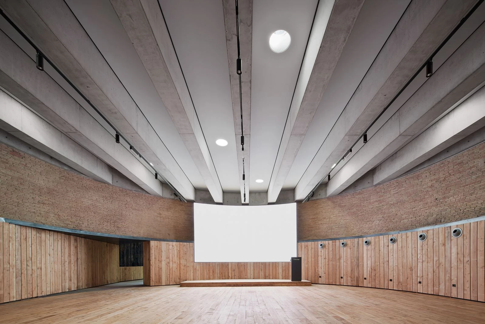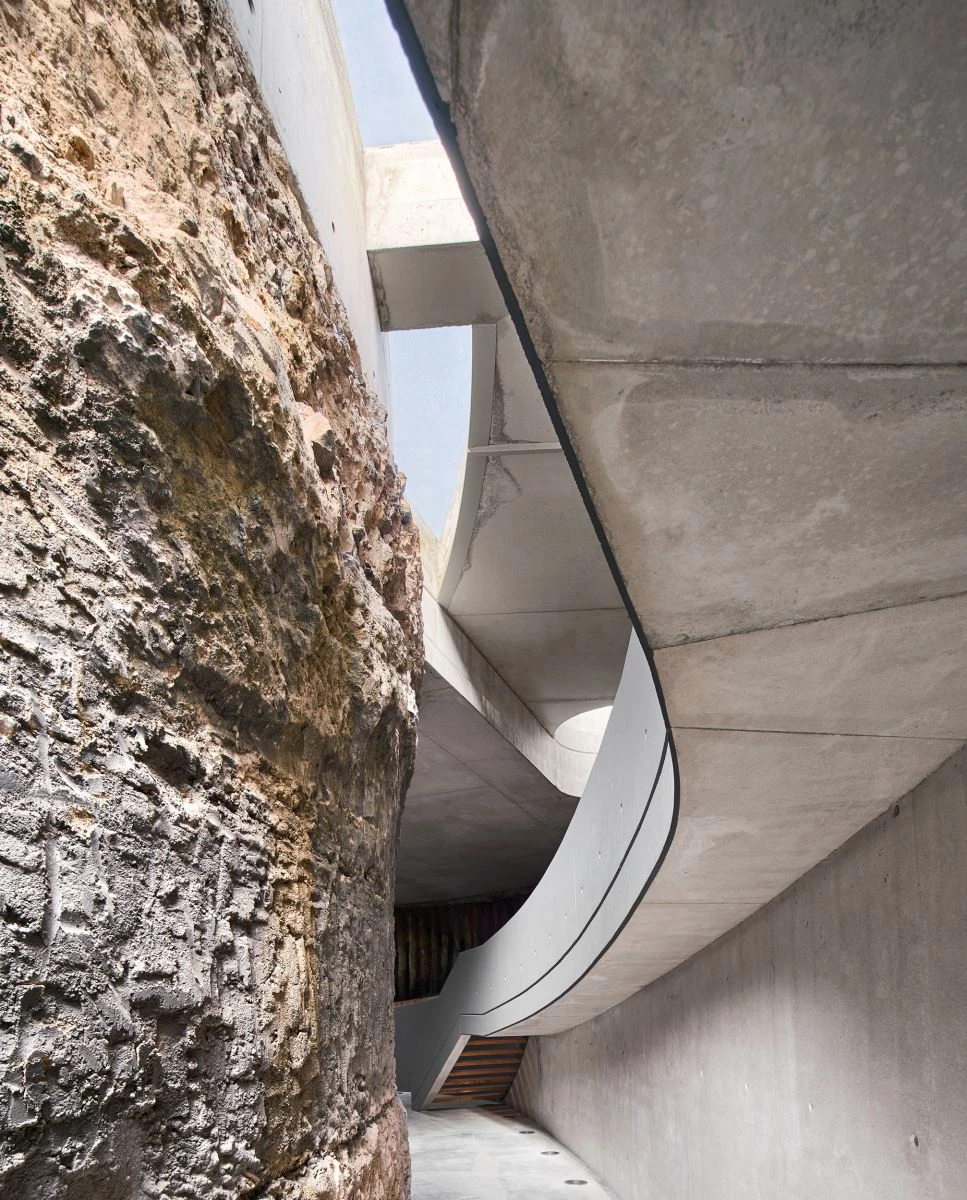 The rest of the intervention consists basically in covering the garden again, guiding light – and people – to the interior with the help of skylights and ramps. Light falls vertically, whereas people descend almost horizontally, taking the time needed to go from light to darkness, from outside to inside. Only the round tank and the ramp surrounding it appear above ground.