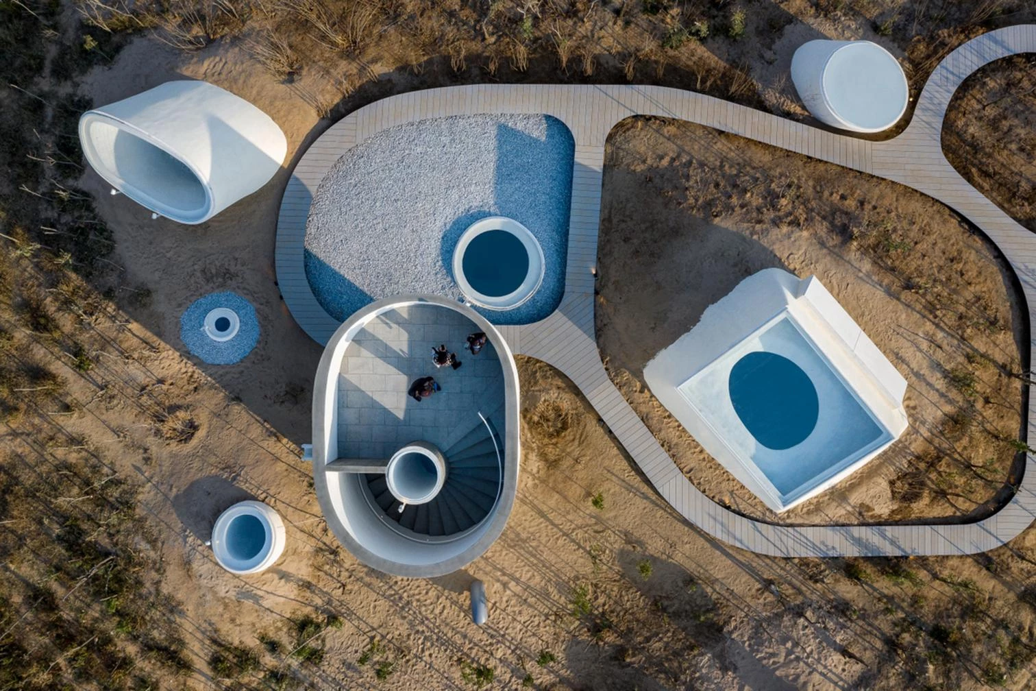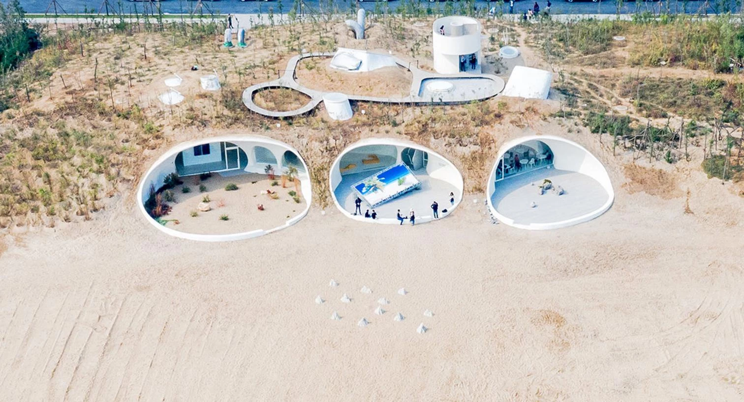 In the coastal city of Qinhuangdao, between sea and sand, a series of underground concrete galleries gives form to a museum for the UCCA, a leading Chinese independent institution of contemporary art. Designed by Open Architecture, the Beijing firm founded by Li Hu and Huang Wenjing, the building is carved into a dune, thus diluting into the natural environment. Including a café, a reading room, seven interior galleries, and three exterior ones, the 930-square-meter construction presents interconnected, cave-like spaces that show the irregular texture of the formworks used. The visitor goes through a long tunnel and the vaulted reception area to get to the largest gallery, which is multifunctional and perforated by a large skylight. A spiral staircase leads to a lookout offering views of the Bohai Sea.