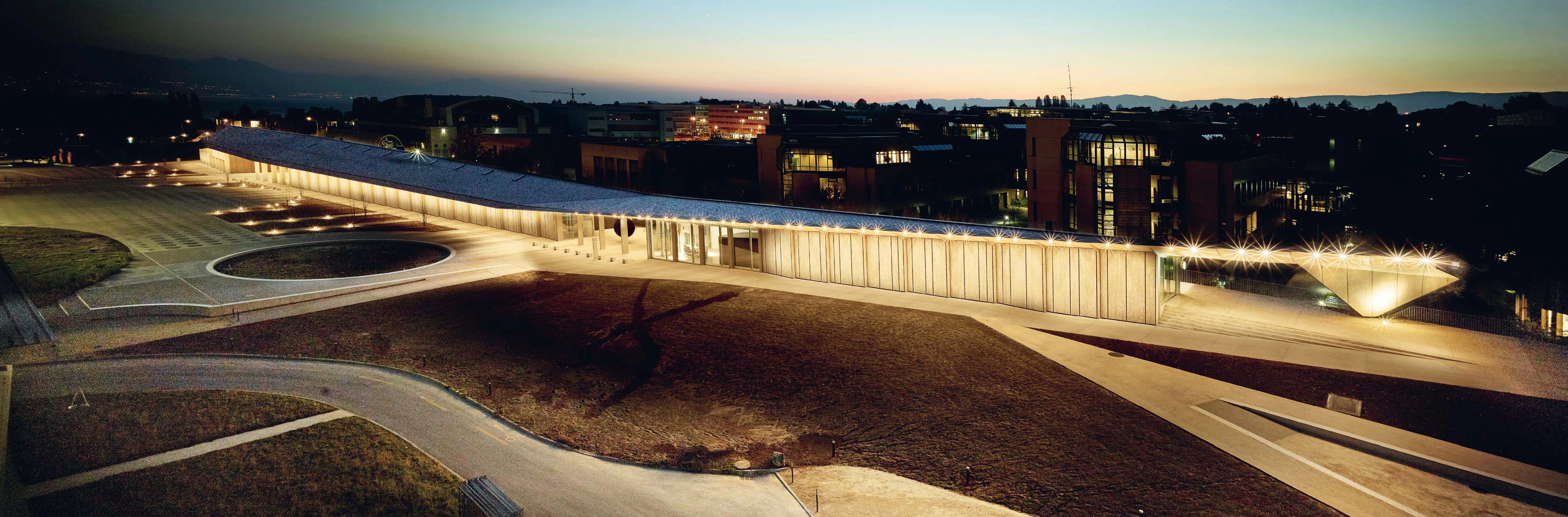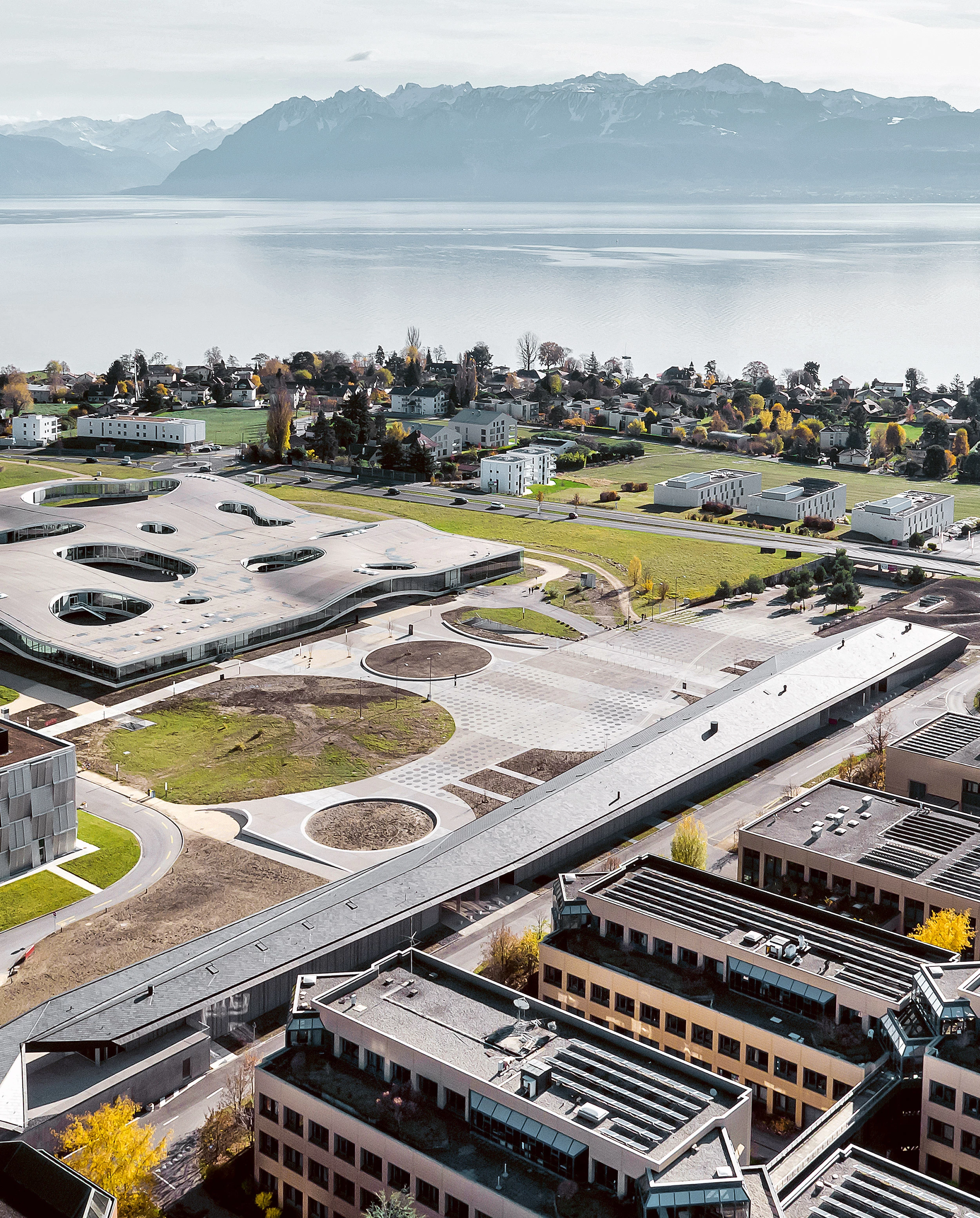 Located by the Rolex Learning Center built by SANAA on the campus of the École polytechnique fédérale de Lausanne (EPFL), ‘Under One Roof’ is a project that gathers three programs: an art and science pavilion, a technology and information gallery, and a Montreux Jazz Café. The 240-meter long roof redirects pedestrian traffic on campus through a continuous north-south portico and by means of two transversal voids in the east-west direction. In order to protect the view of the lake from the existing plaza, the building remains very thin in its northern end, about 5 meters, and its section widens up to 16 meters on its southern end.