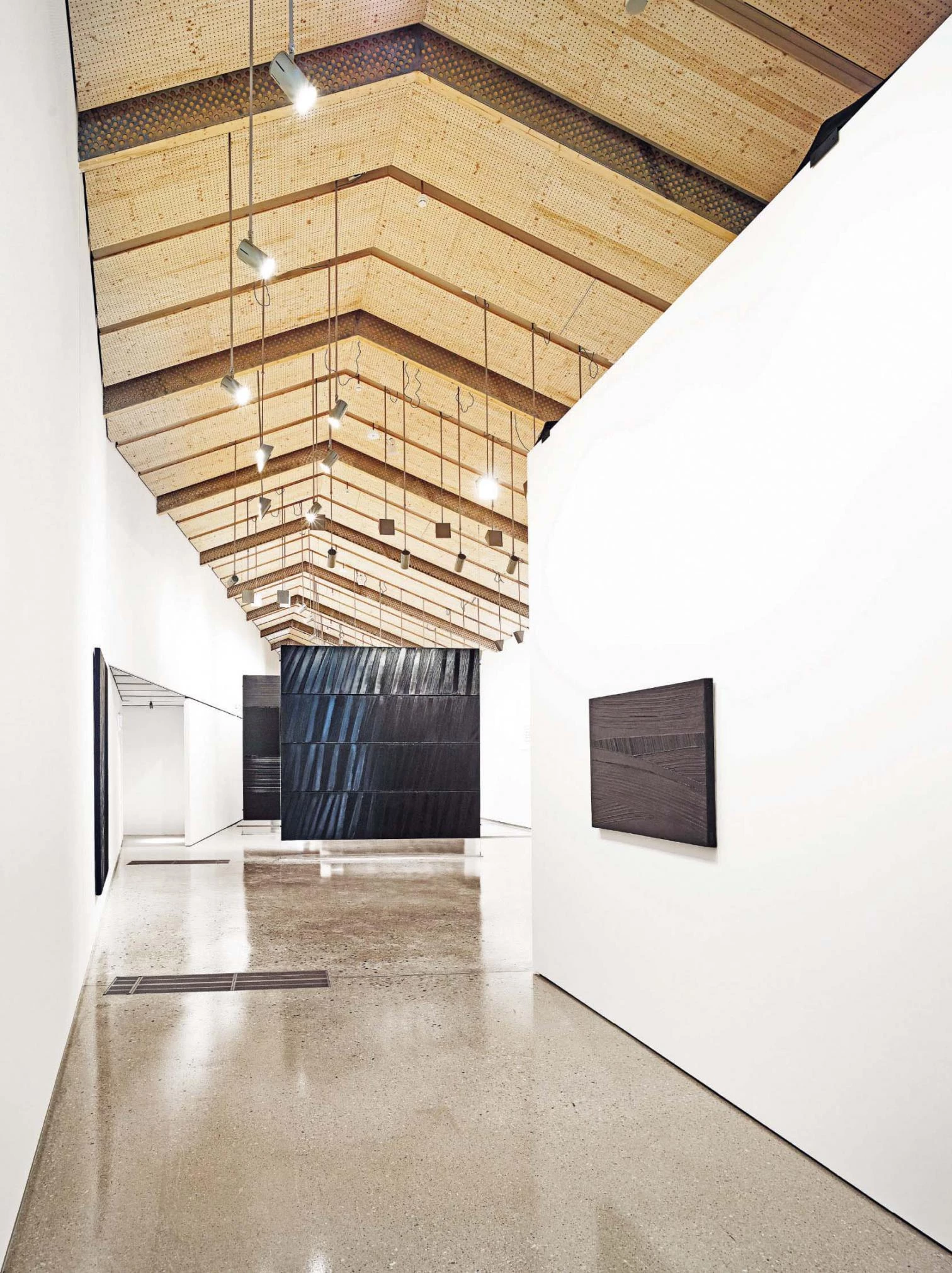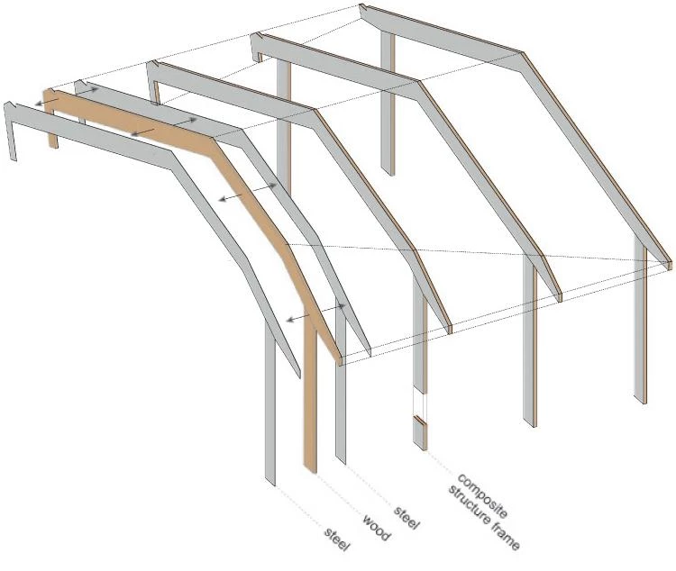 The structure, made up of 57 frames, adapts to this variable condition with an innovative solution combining wood and steel. Instead of adjusting the size of the beams and columns, each frame consists of a wood core and two exterior metallic layers of varying thickness