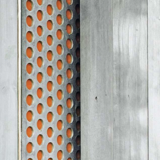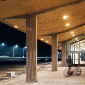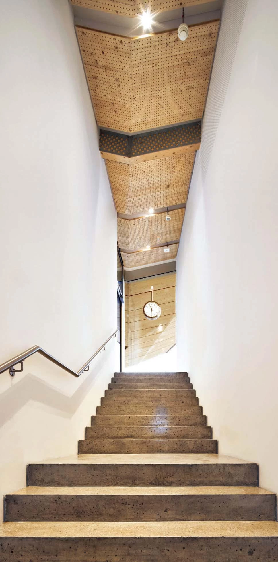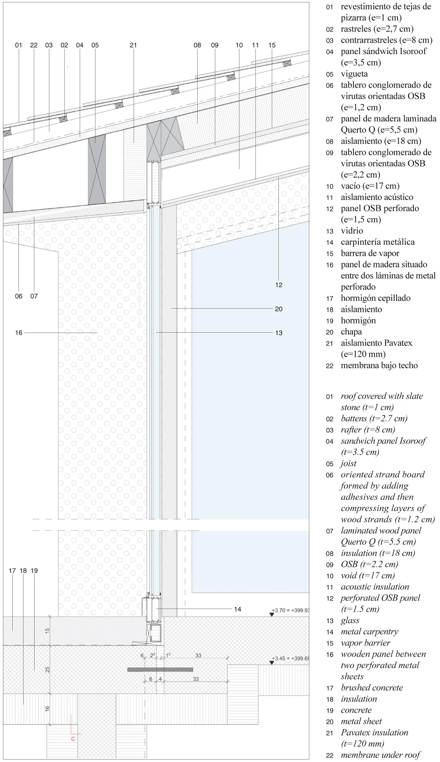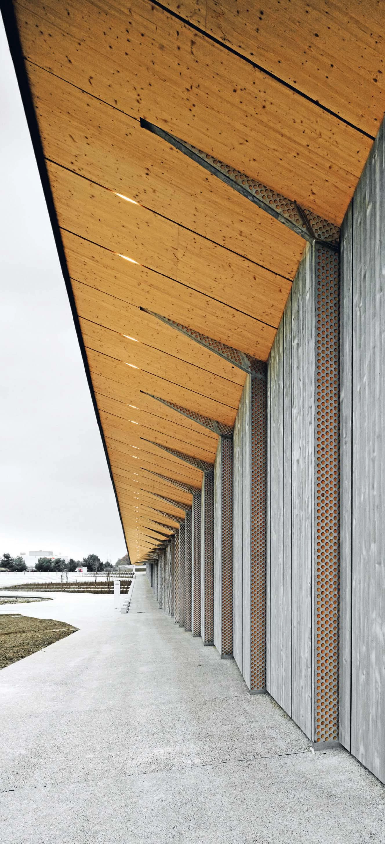to bear the different degrees of stress. In this way, the parts can be modular and visually uniform without being oversized. The building blends with its context thanks to its size and to the use of local materials like fir wood on the facade and slate on the roof.
