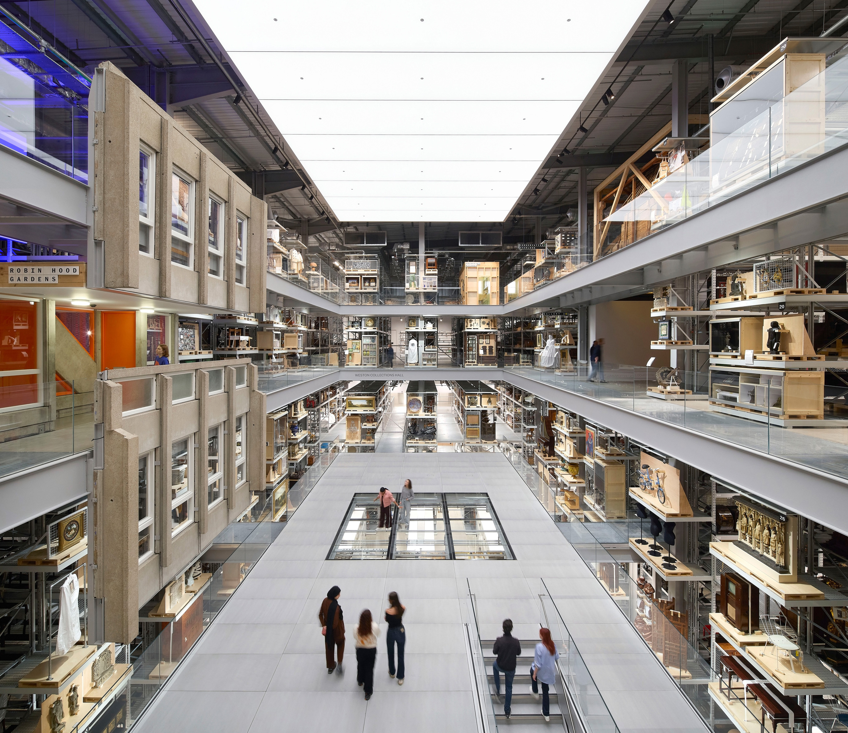 In the heart of the building is the monumental Weston Collections Hall, 20 meters high and crowned with translucent openings in the ceiling, with platforms and walkways giving panoramas of the collections. More than a hundred small exhibitions are viewable here, directly integrated into the storage systems, from Buddhist statues to PJ Harvey’s guitar and a model of the bowl containing the 2012 Olympic torch.