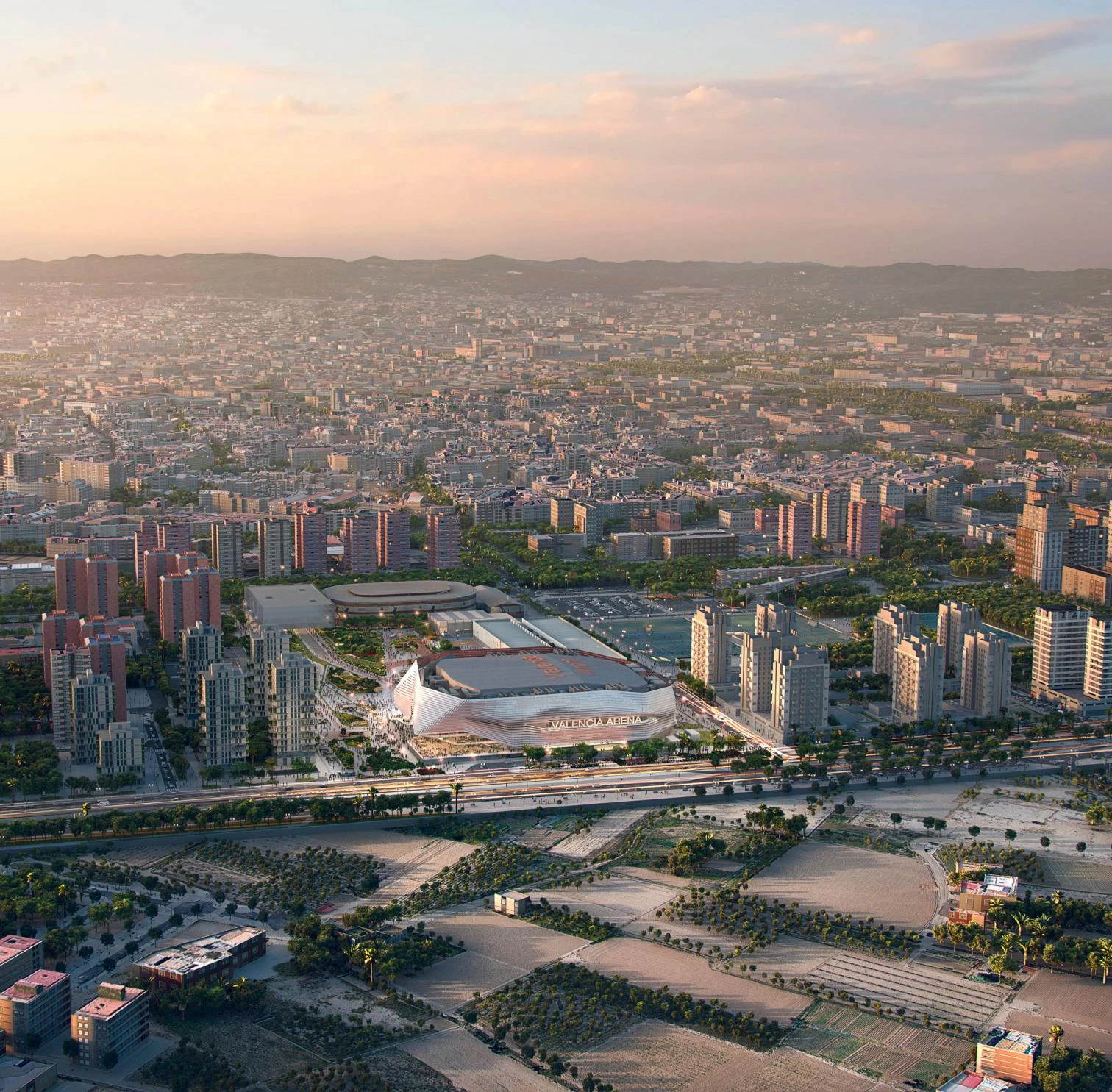 Containing a floor area 47,000 square meters, the building rises on land bordered by the streets Ángel de Villena, Bomber Ramón Duart, and Antonio Ferrandis, in Valencia’s Quatre Carreres neighborhood, close to L'Alqueria del Basket and the Fuente de San Luis pavilion. The project also includes a 20,000-square-meter public park and over 1,300 parking spots.