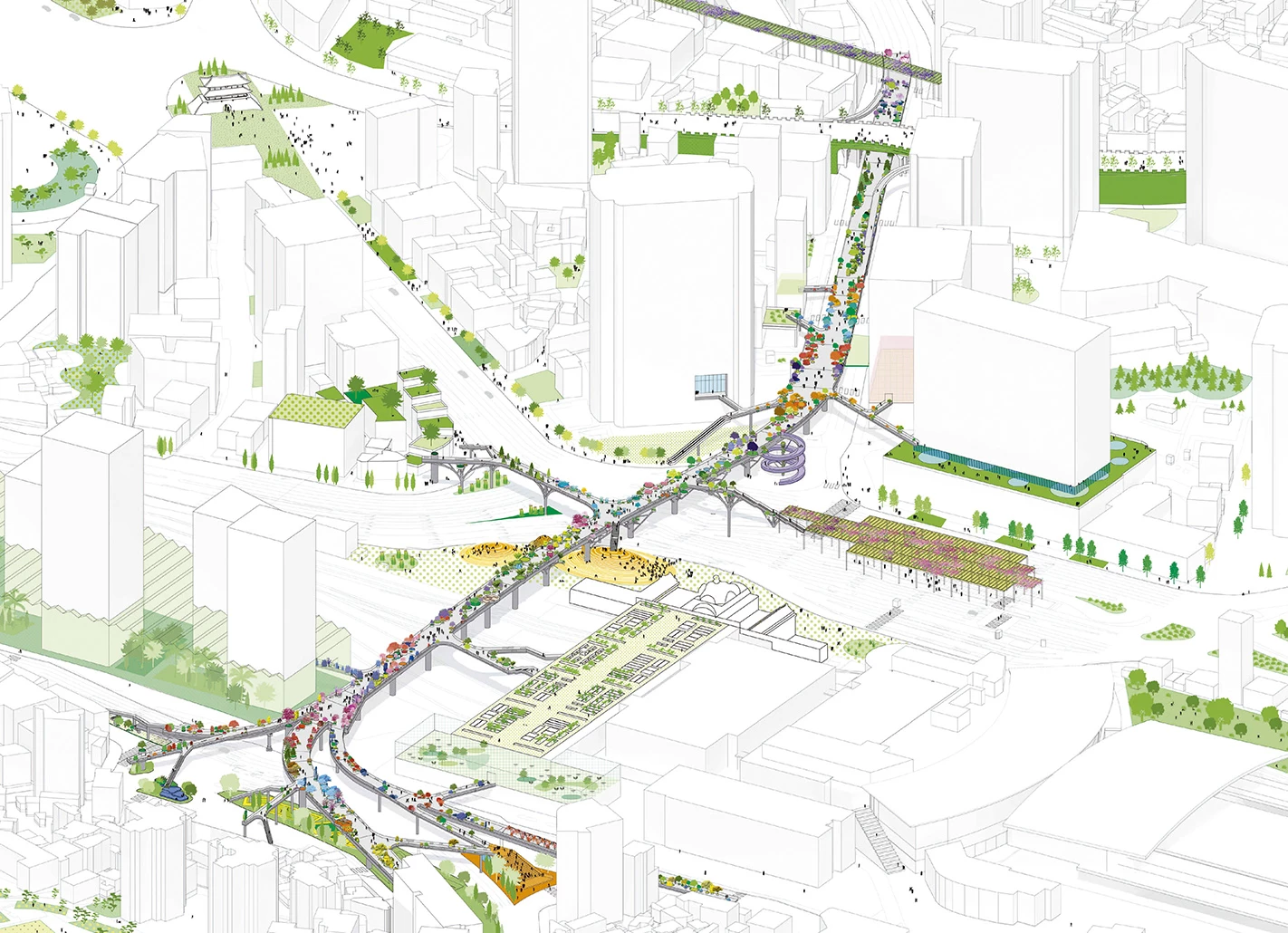 The ambition to make this space as green as possible while introducing new leisure functions called for a modular and adaptable approach. The design proposes a library of local plants arranged according to their name in the Korean alphabet, an arboretum offering visitors the possibility of interacting with the plants and discovering new species. In addition to the circular plant pots of varying sizes, a series of customizable activators such as tea cafés, flower shops, street markets, libraries, and greenhouses provide a catalogue of elements which will enliven the Seoul Skygarden. Additional stairs, lifts, and escalators can connect to the Skygarden, sprouting like branches from the existing structural piers and generating a seamless transition between the different urban tissues.