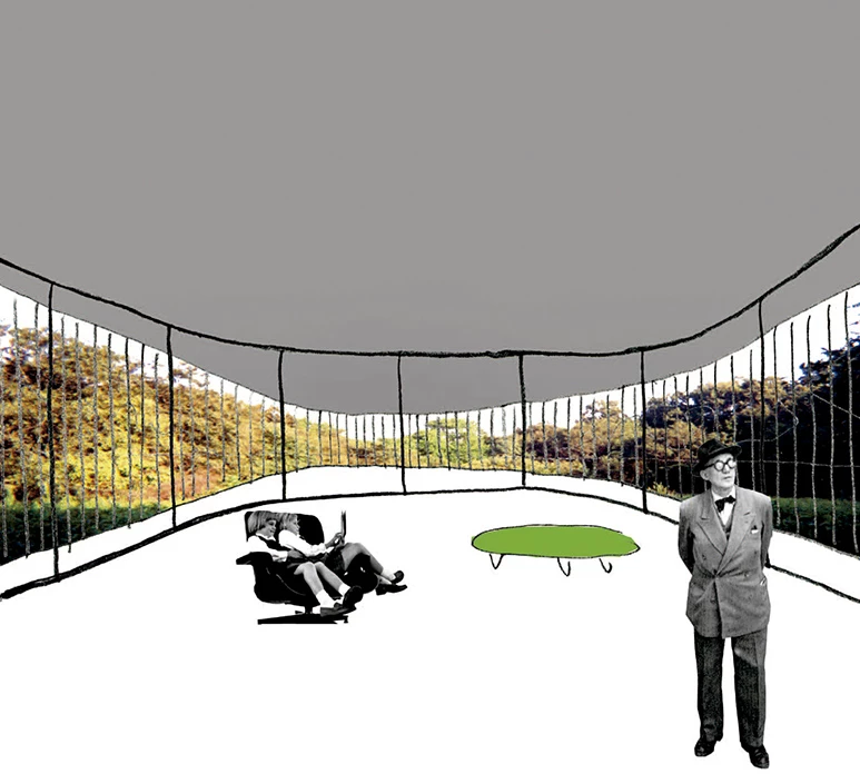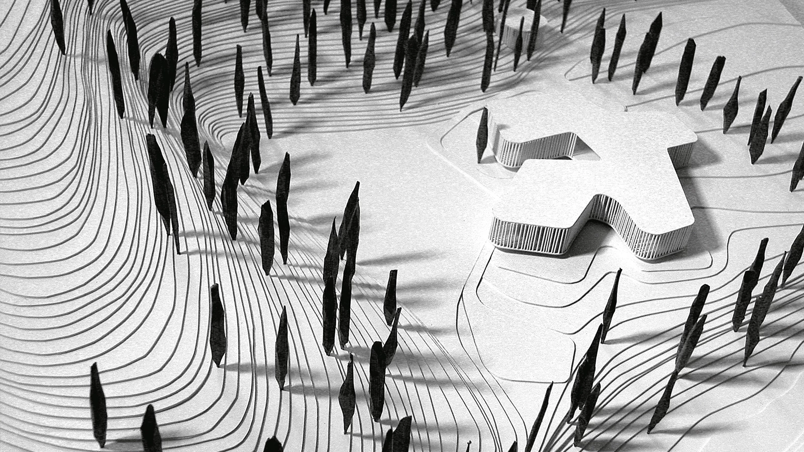 Its shape is that of a breath exhaled into the air, always variable and continuous. The entrance to the house operates like a glass funnel, giving the impression of being inside when it is actually an exterior. The eye perceives spaces that are alternately compressed and dilated, an intimation of the act of breathing of a living organism. In the proximity of such splendorous nature, the house is a space that rolls around itself, that can, like clothing, turn itself inside out. It is a space defined by the changing band that softens the summer sunlight and directs the points of view.