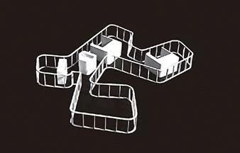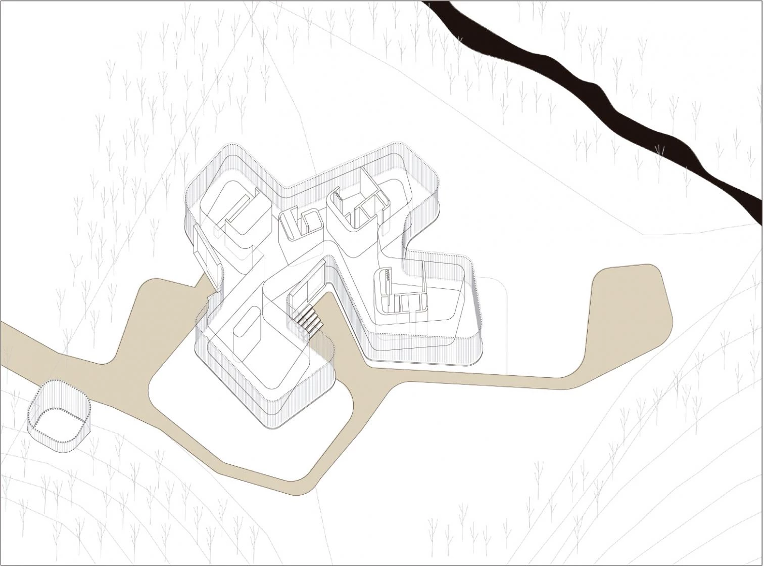 The spatial understanding of the house as a whole permits flexible and versatile functioning. Common spaces, such as the kitchen and the living room, are near the entrance – open spaces with a transparent perimeter that allows for abundant ventilation and natural lighting. Next to the entrance is a small toilet room and wardrobe. The bedroom program has been thought out in such a way as to suit either a family unit or a more loosely associated group of individuals. Four bathrooms serve four rooms, which can be equally used as bedrooms or studios. An independent structure, located some meters beyond the perimeter, serves as a utility and storage room. A paved area at the end of the pathway serves as a car park. The rest of the site is split into gardens and gravel walking paths.