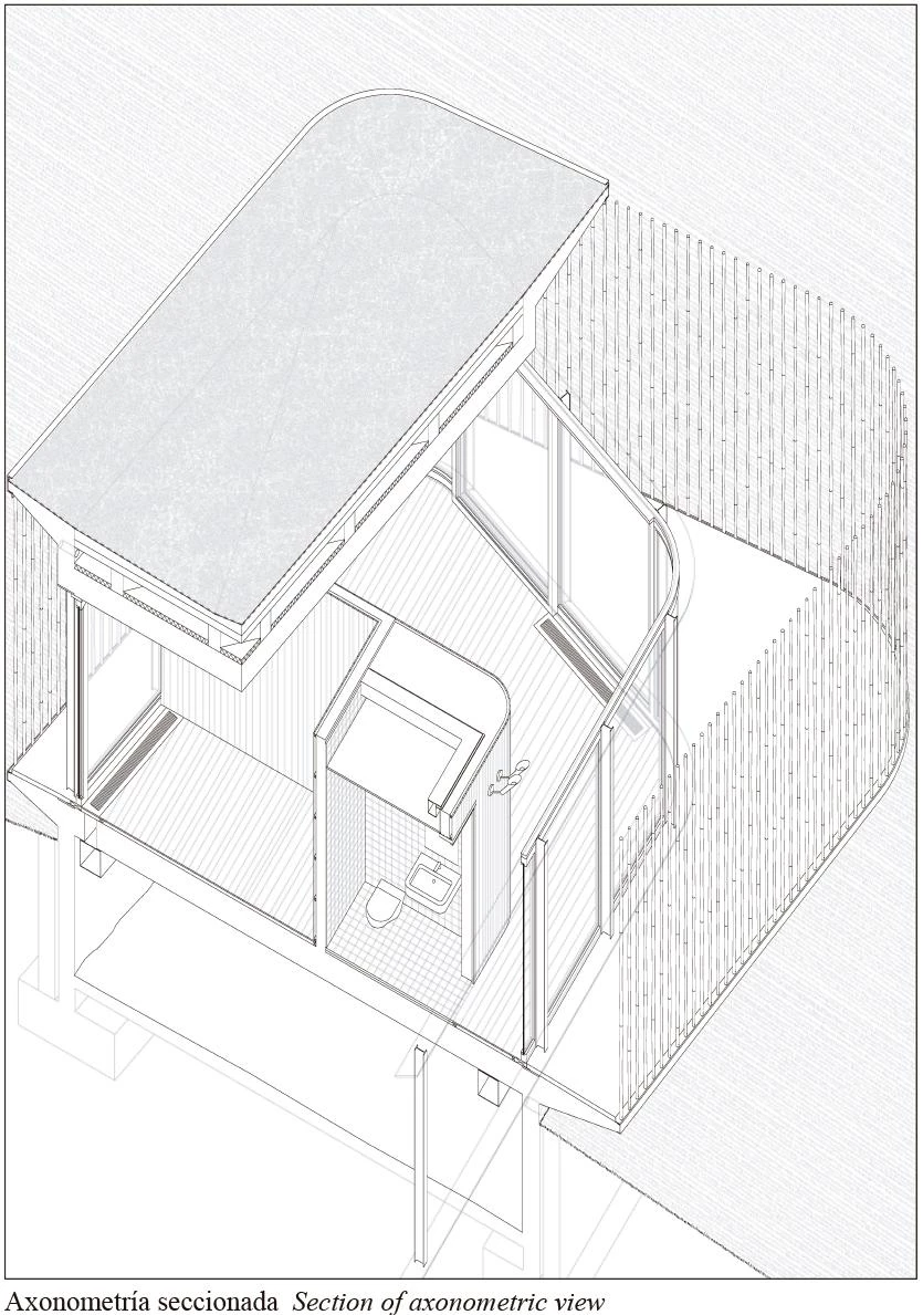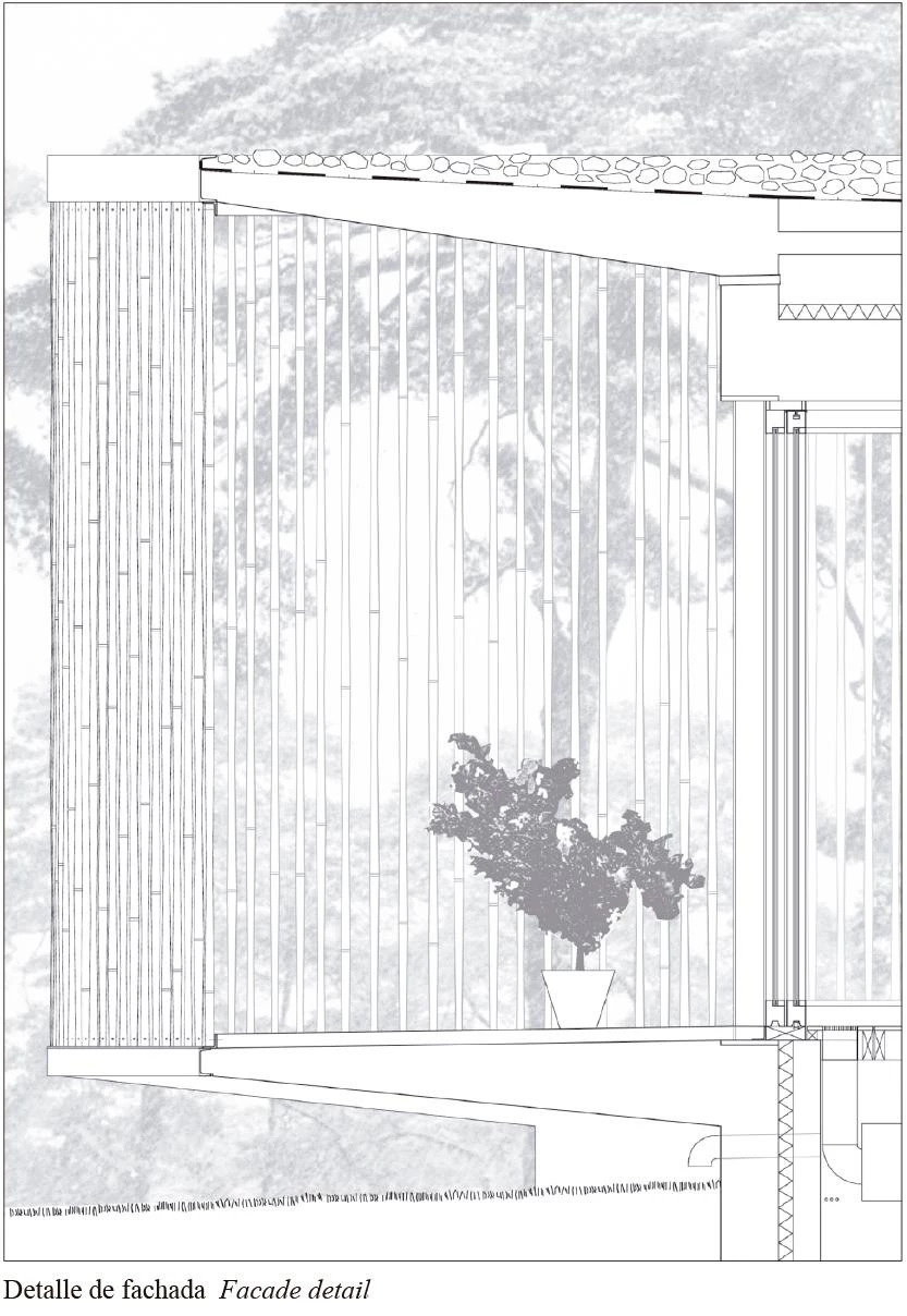 The house is imagined as a clearing in the woods bound by two perimeters: the interior one, continuous and transparent, holds the structure; the exterior one, beyond the first, is formed from a bamboo screen. The volume is defined by a fluid border that does not present a physical boundary, but creates intermediacy rather, a threshold where interior and exterior can be mistaken, allowing contact with nature.
