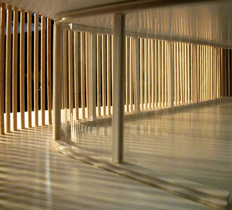 The interior is fluid and continuous, a concrete slab on which the spaces for living have been drawn by an innocent hand, like chalk on a blackboard. The technical instruments are arrayed like furniture, like people sitting in a forest clearing. The concrete slab rests on the laminated steel pillars of the inner, glass perimeter; these pillars, placed approximately a meter and a half apart from each other, allow minimum sections of 6x10 centimeters. The glass is fitted between the pillars, using the steel structure for window frames. This structure at once materializes the glass perimeter and diffuses its structural appearance, emphasizing the linear continuity of the band.
