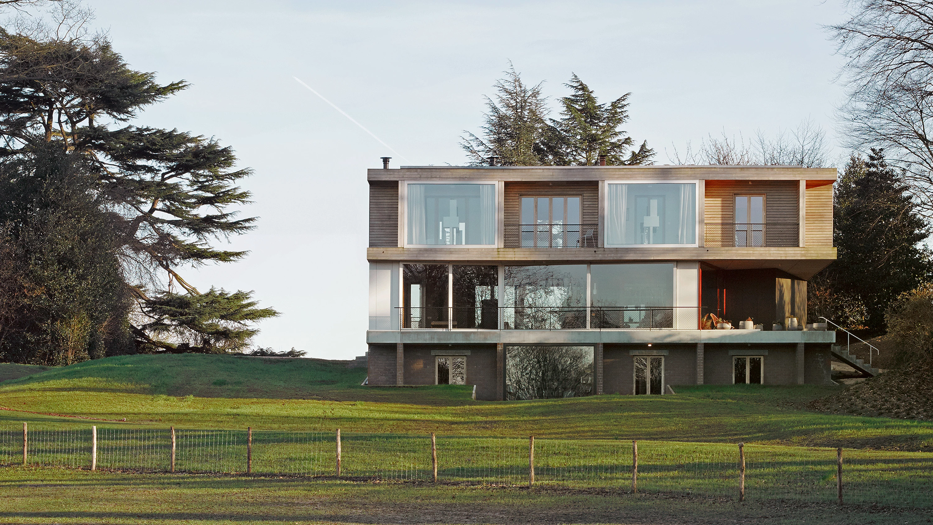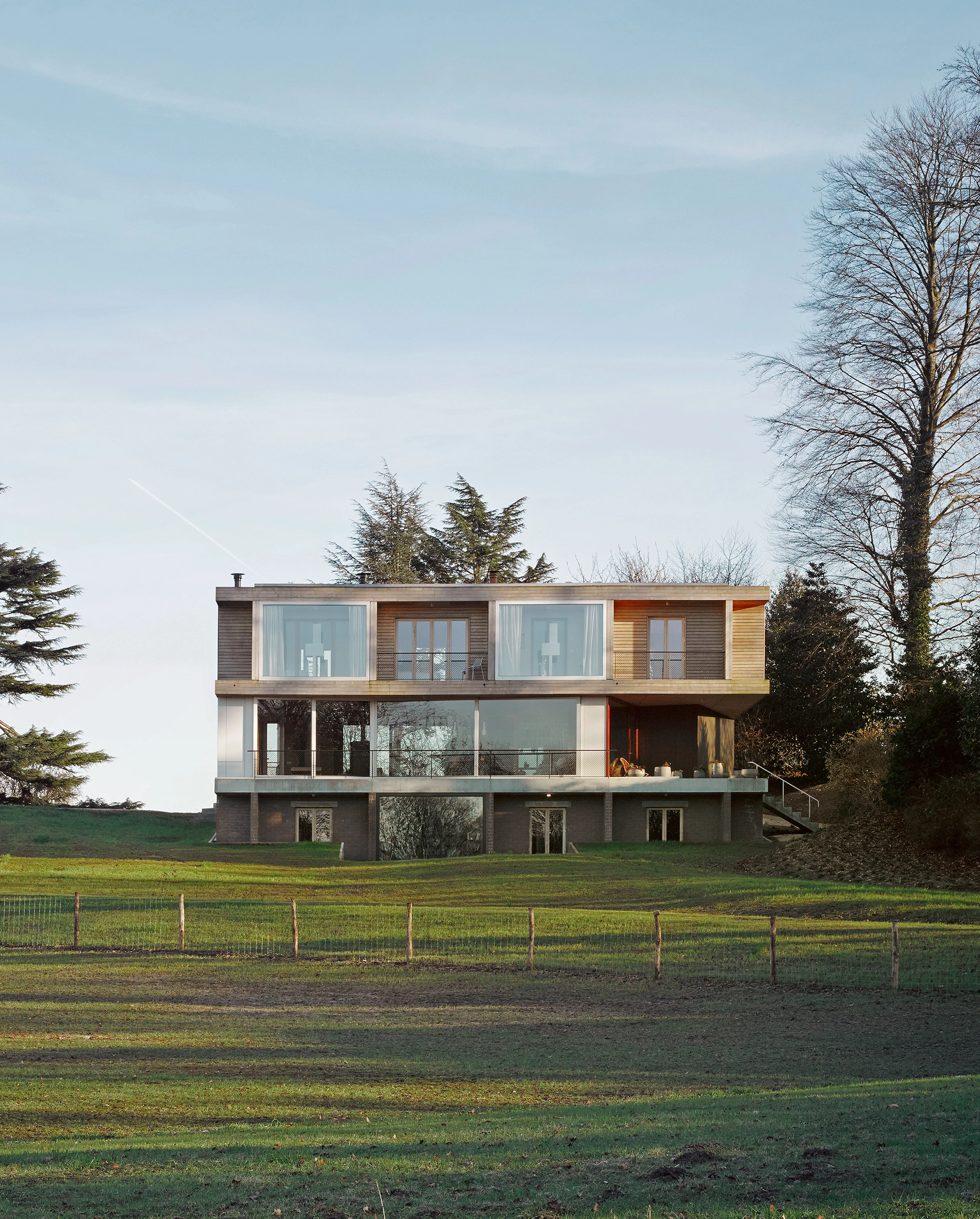 Set on a large, secluded site on the periphery of Brussels, Villa Der Bau replaces a mansion from the 1900s, taking roughly its volume. The base of the building, half-submerged in the rising terrain, is formed by a compact grid of rooms organized as an enfilade through central double doors. The same plan is repeated on the upper floor, though the structure is different. Whereas the base is a traditional construction of brickwork and concrete flooring, the upper floor consists of massive timber panels that are structurally joined to create an extremely stiff, waffle-like structure, supported only by a handful of columns. This allows the intermediate floor to have an open plan (uniting kitchen, dining and living areas) in which a set of five compact ‘boxes’, linked by sliding windows, contain auxiliary spaces and connections to the other floors, while also performing as structural supports. The glazed surfaces suspended between them can slide wide open to connect the living space directly with the surrounding landscape. As the ultimate gesture to emphasize the private nature of the site, the most intimate spaces are pushed to the extremities of the plan and framed with large glass panels towards the landscape...