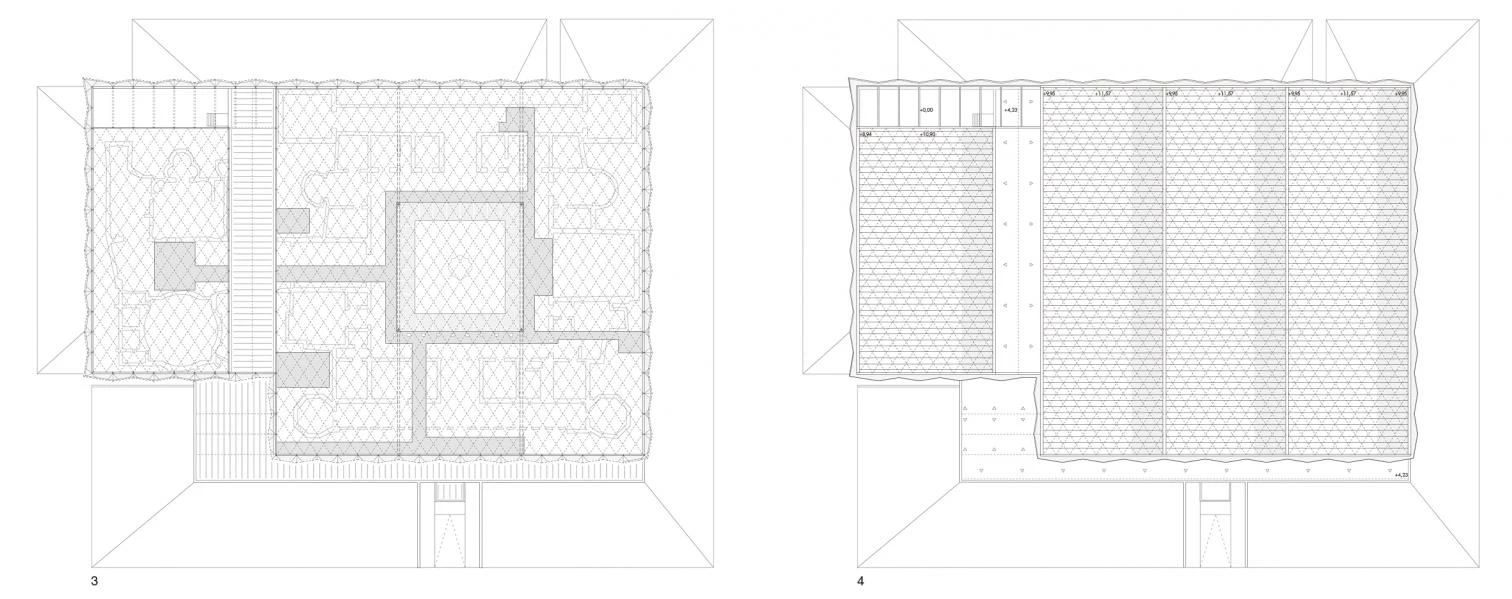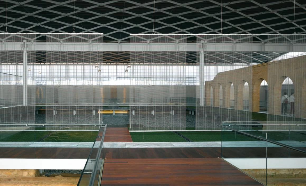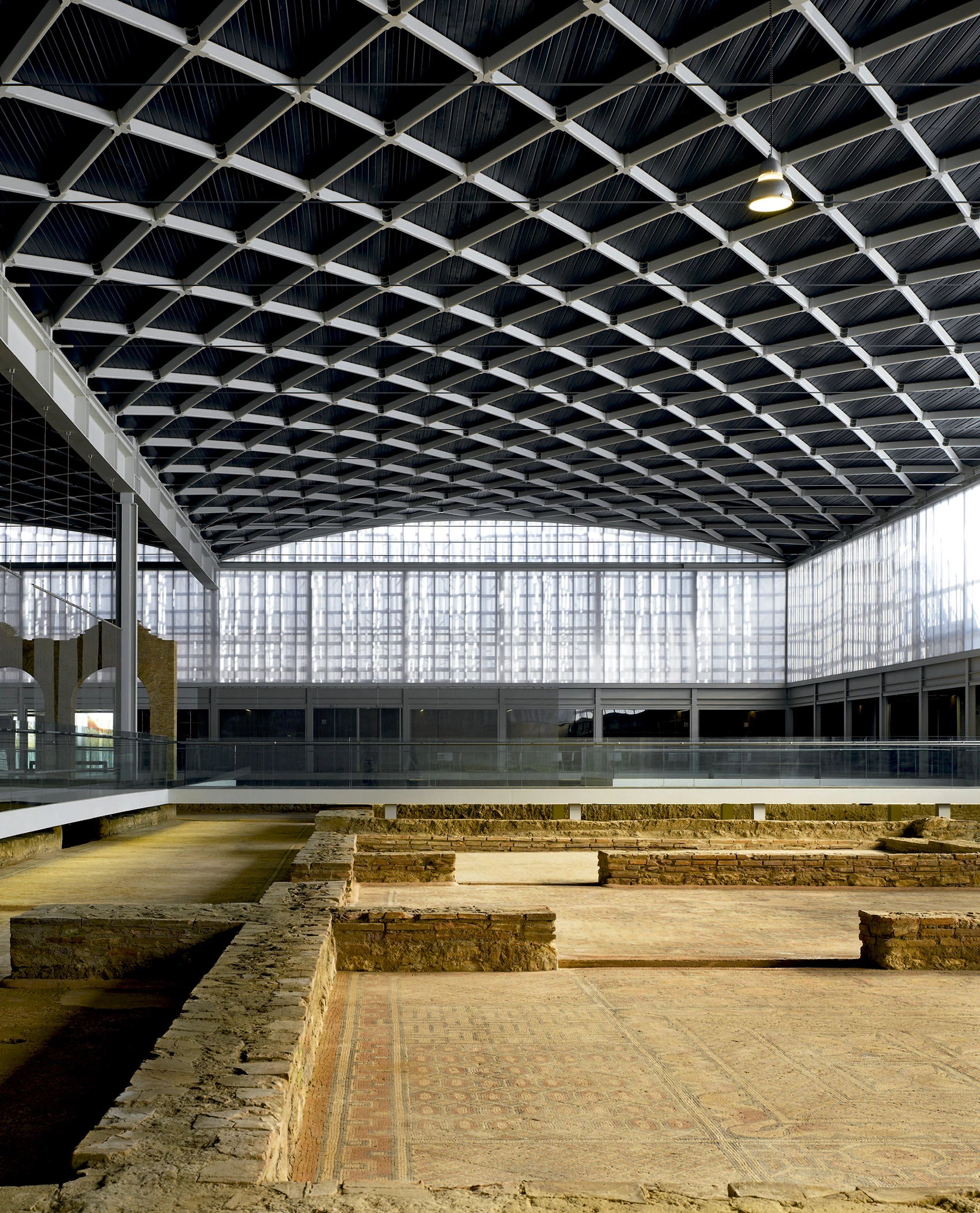 From the roof hang a series of steel meshes that restore the position of the villa’s original walls, favoring the views of the mosaics in differentiated ambits and showing the villa’s original layout. A wooden footbridge, slightly elevated over the mosaics, connects all the halls around the central courtyard, guiding visitors through the thermae and leading them through the spaces that make up the functional program of the museum.