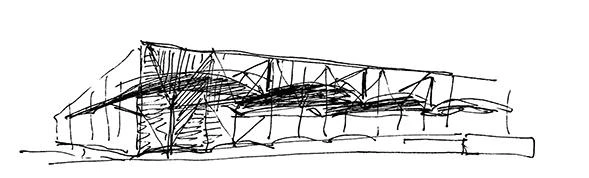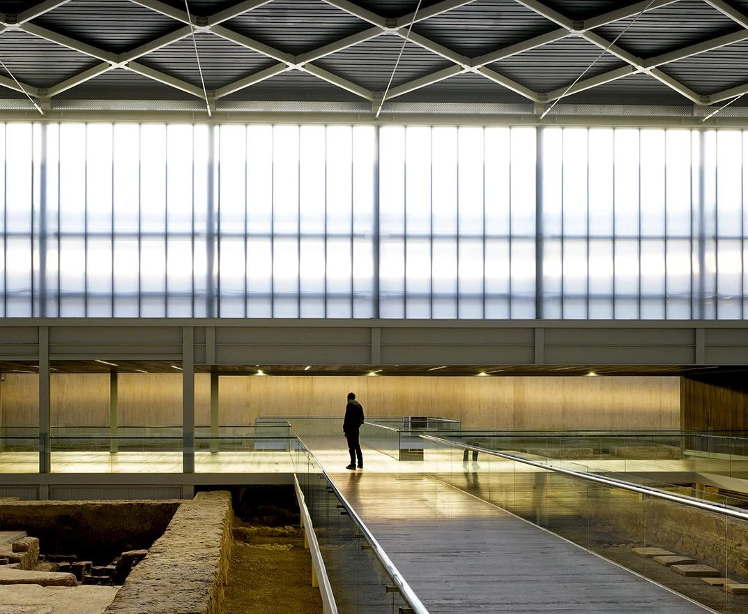 The archaeological premises are organized in three pieces, all gathered under a colossal continuous roof that protects the whole area and that rests on metal columns delimiting a courtyard. The segmental domes of the roof have been built with a rhomboidal structural framework made of steel tubes, clad on the outside with aluminum sheet, which show a coffered finish in the interior. The extensive occupation of the site and the need to avoid altering it during the construction work, in addition to its location in a rural environment, recommended the use of a prefabricated modular system. The dimensions of the rhomboidal elements ease their transportation and facilitate the on-site assembly of full arches that, with twenty-five meter spans, were raised to their final position and fixed with screws.
