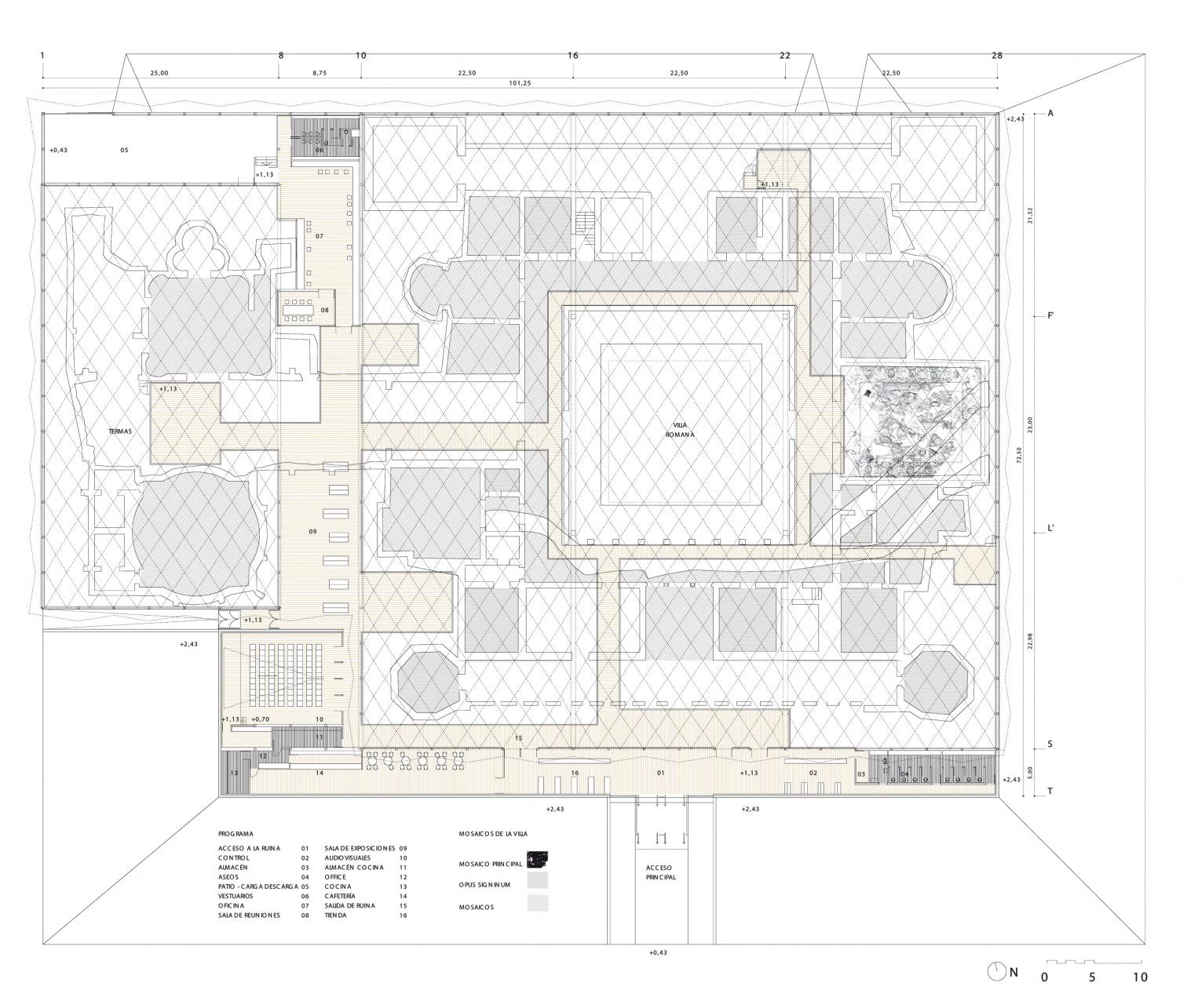 In the project designed to protect the archaeological site of La Olmeda, ancient times coexist with modernity and architecture is set in contrast with the landscape. These concepts wish to make visitors aware of the unitary character that these fragments of the past had. The different elements of the program – the villa and the thermae with their mosaics, the museum and a research center for archaeologists – are protected by a perforated metallic skin of steel and polycarbonate that wraps the complex and nuances the entrance of natural light.