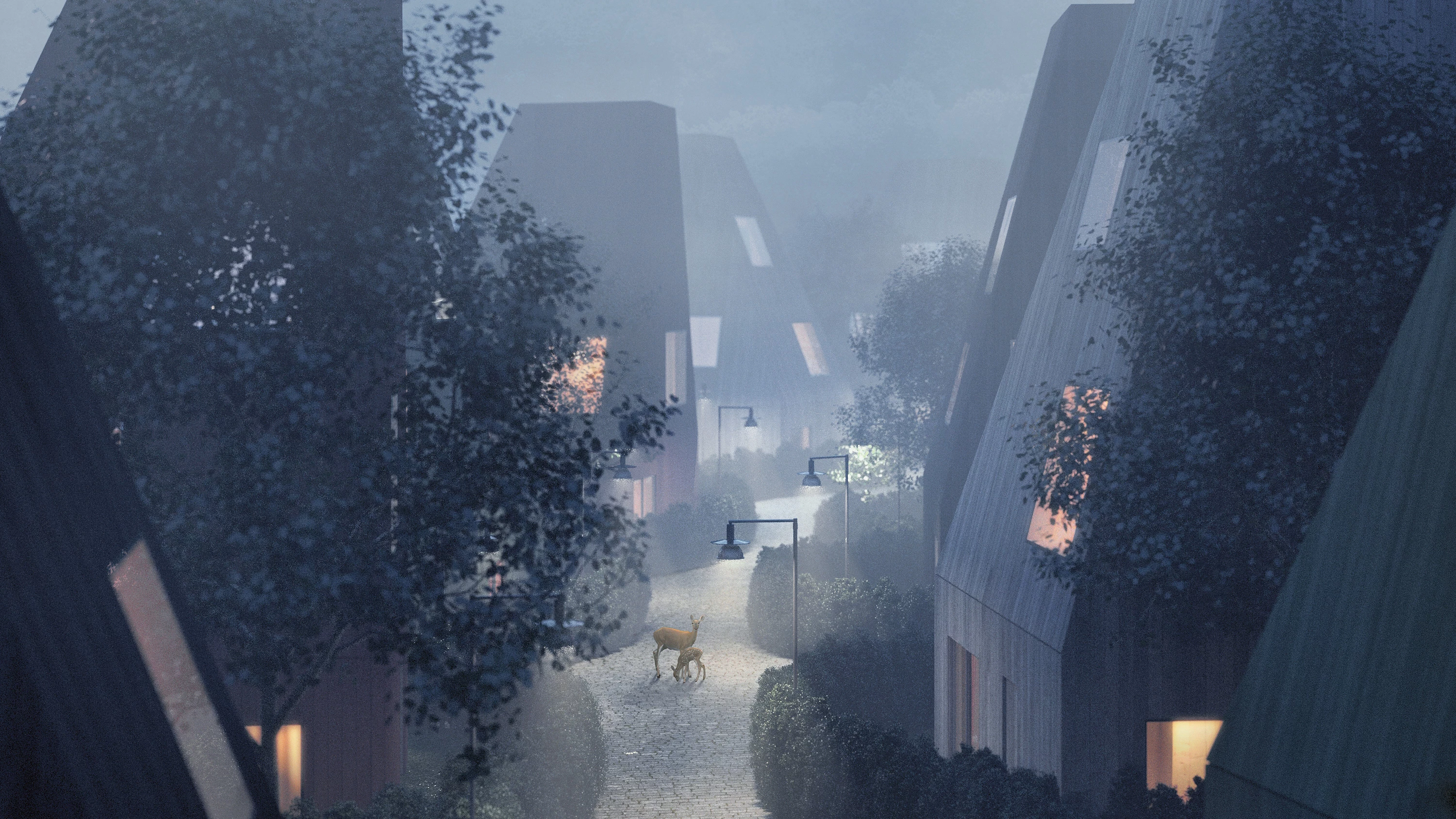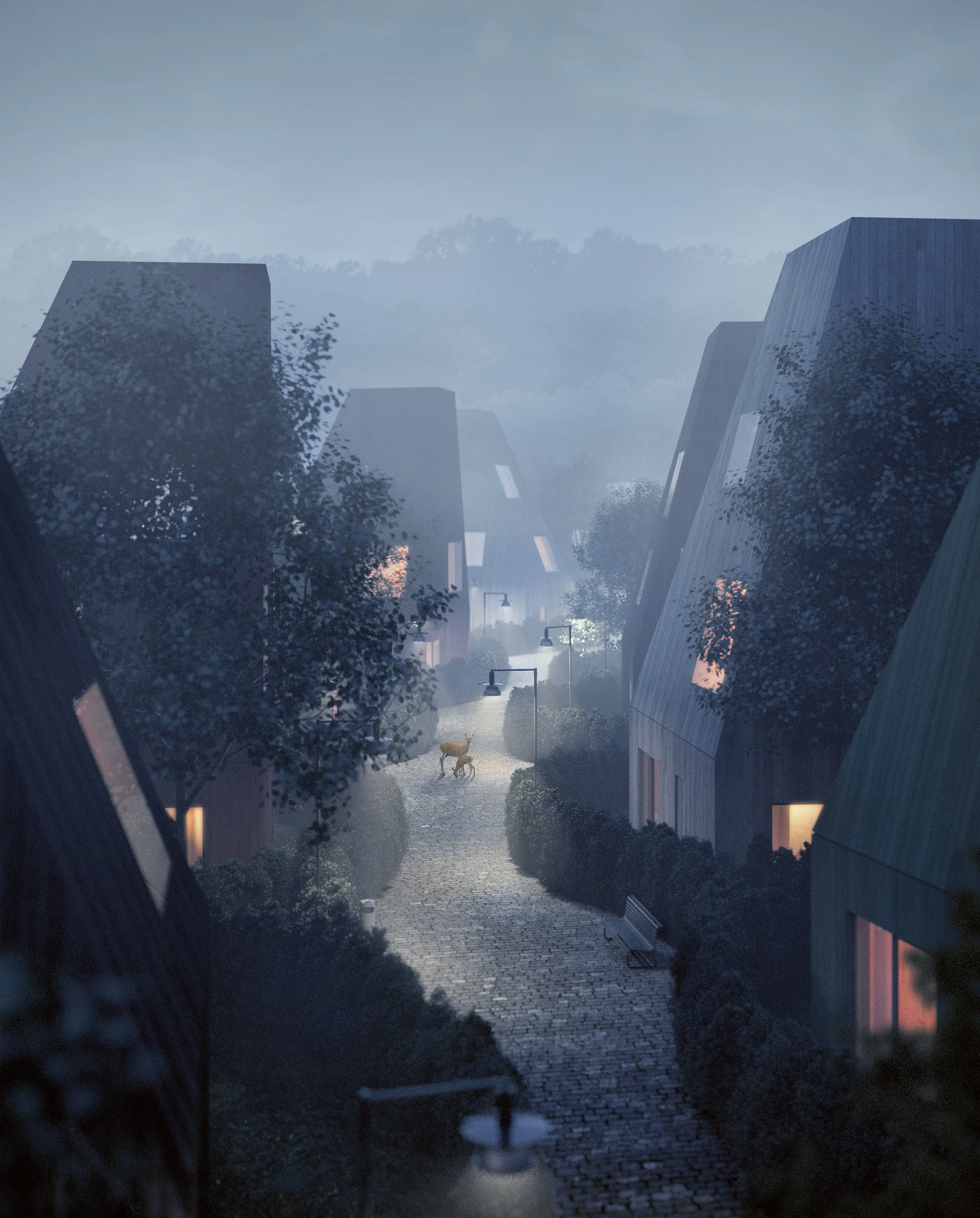 The houses are given different colors and a compact design in three levels. The rounded sites are surrounded by vegetation, and a network of meandering pathways connects the neighborhood internally as well as link it out towards the surrounding area...