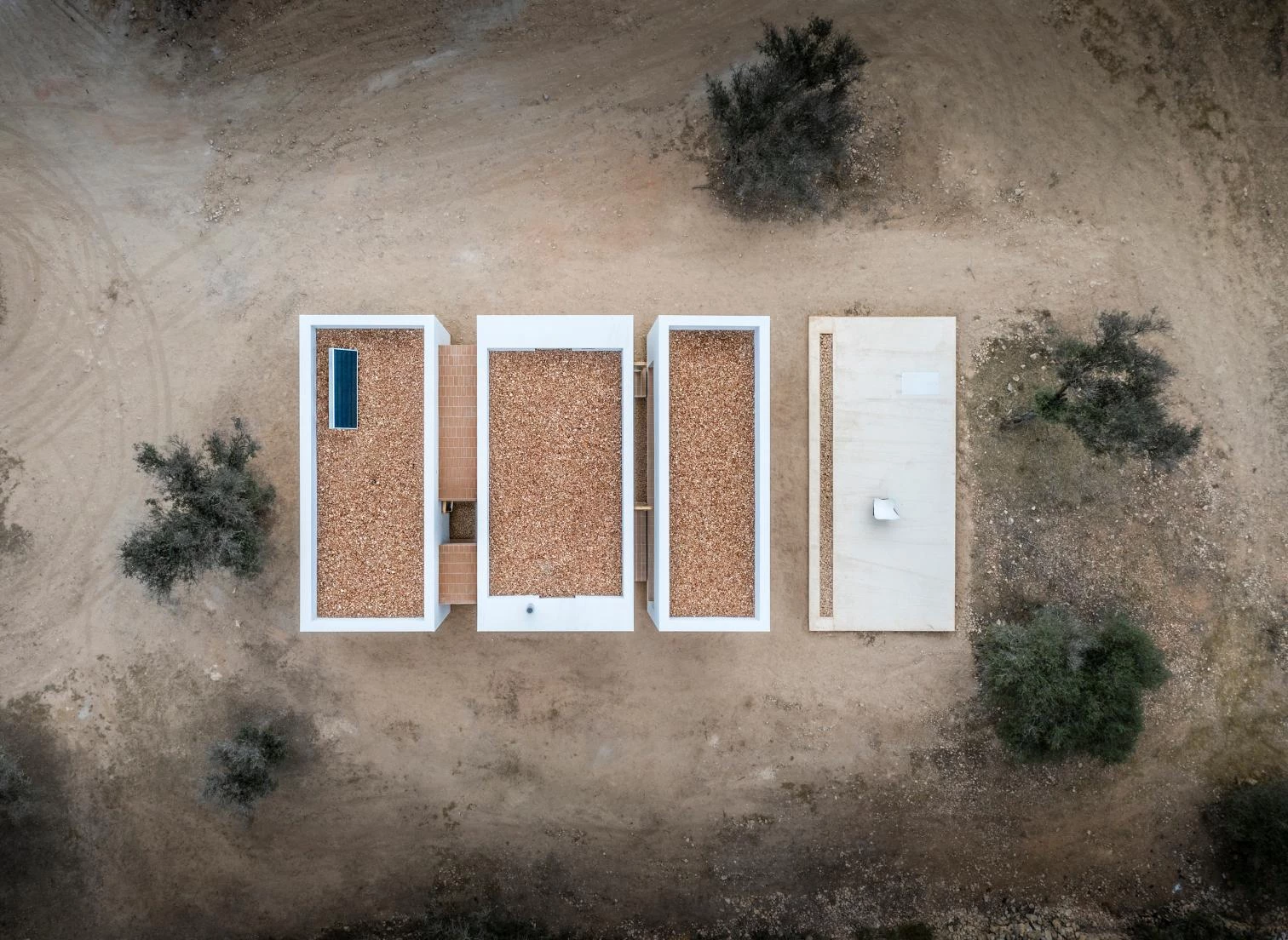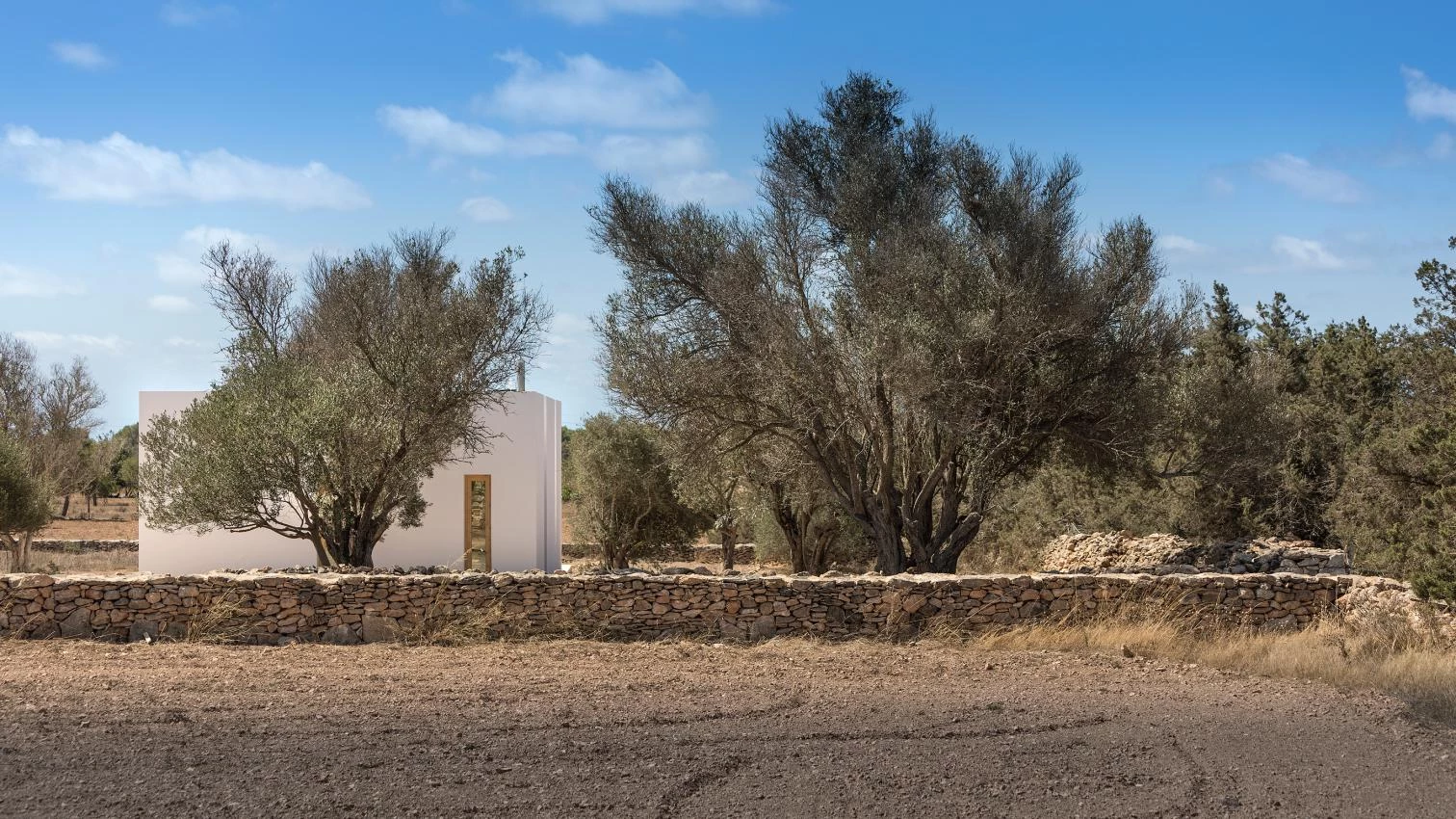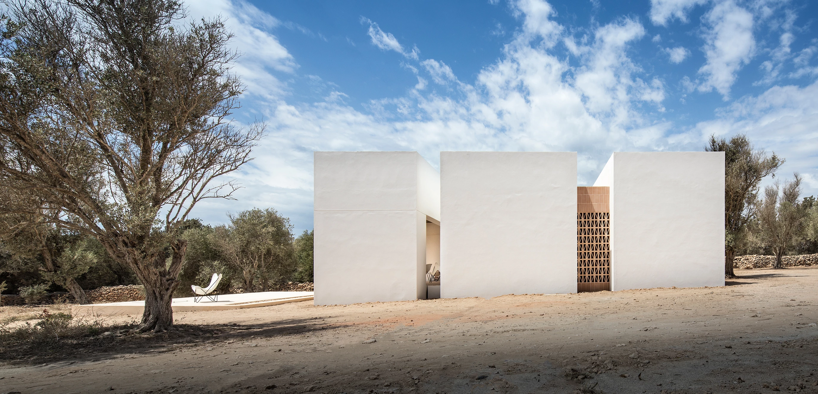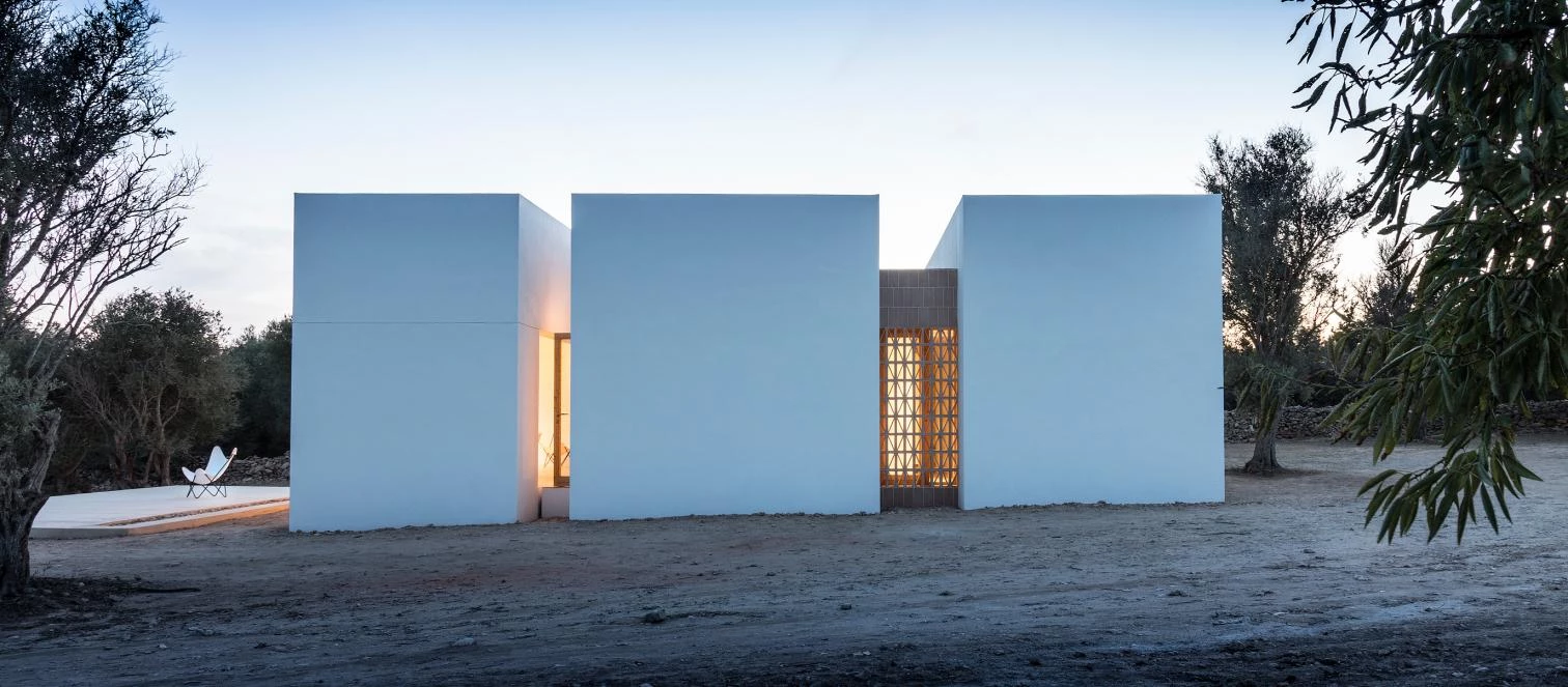 A rural plot in Formentera, one of the Balearic Islands, is the site of this project carried out by a team led by Marià Castelló and Lorena Ruzafa. With a built area of 94 square meters, the work is fragmented into three independent white volumes, reducing its scale and blending better into the landscape of wheat and oat fields as well as almond and fig trees. From south to north, the first block harbors a porch, the second the dwelling’s shared spaces, and the third two bedrooms.