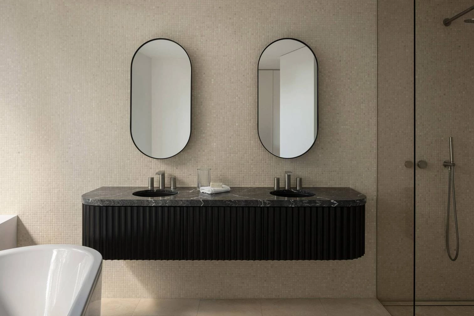 The apartments vary in size between 90 and 338 square meters. The interiors are organized around the central circulation core, creating contrasts between dark joinery and white surfaces.