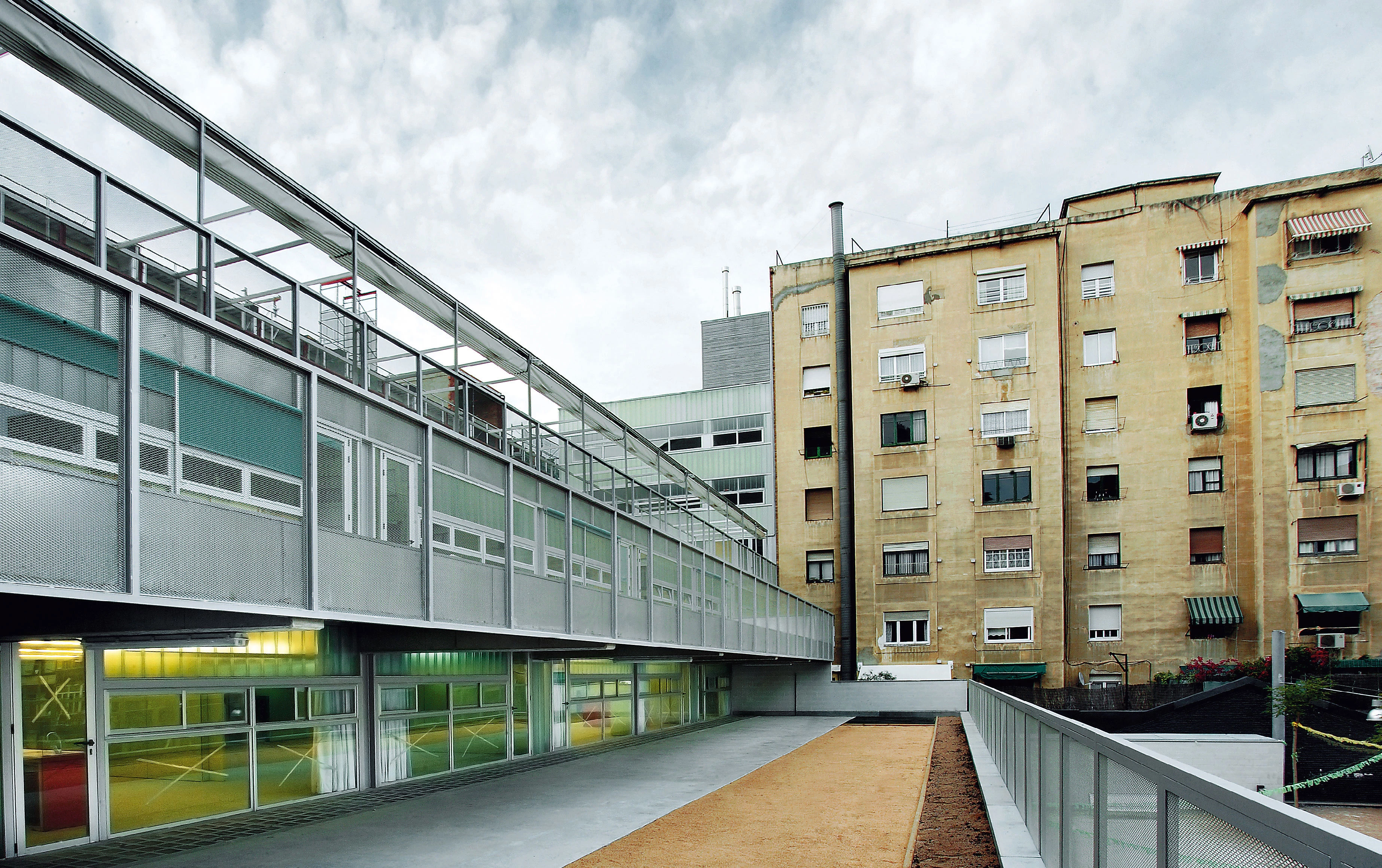 Clearly differentiated in their finishes, the two main volumes stand parallel to one another. The piece more in contact with the street contains the dwellings, whereas the one housing the schools folds towards the interior.