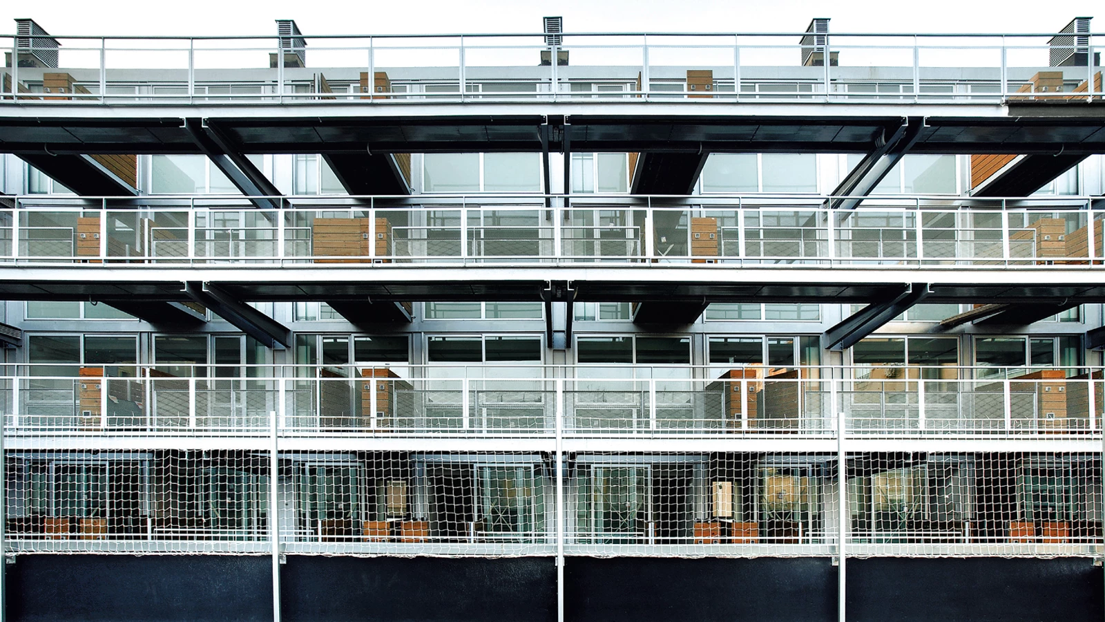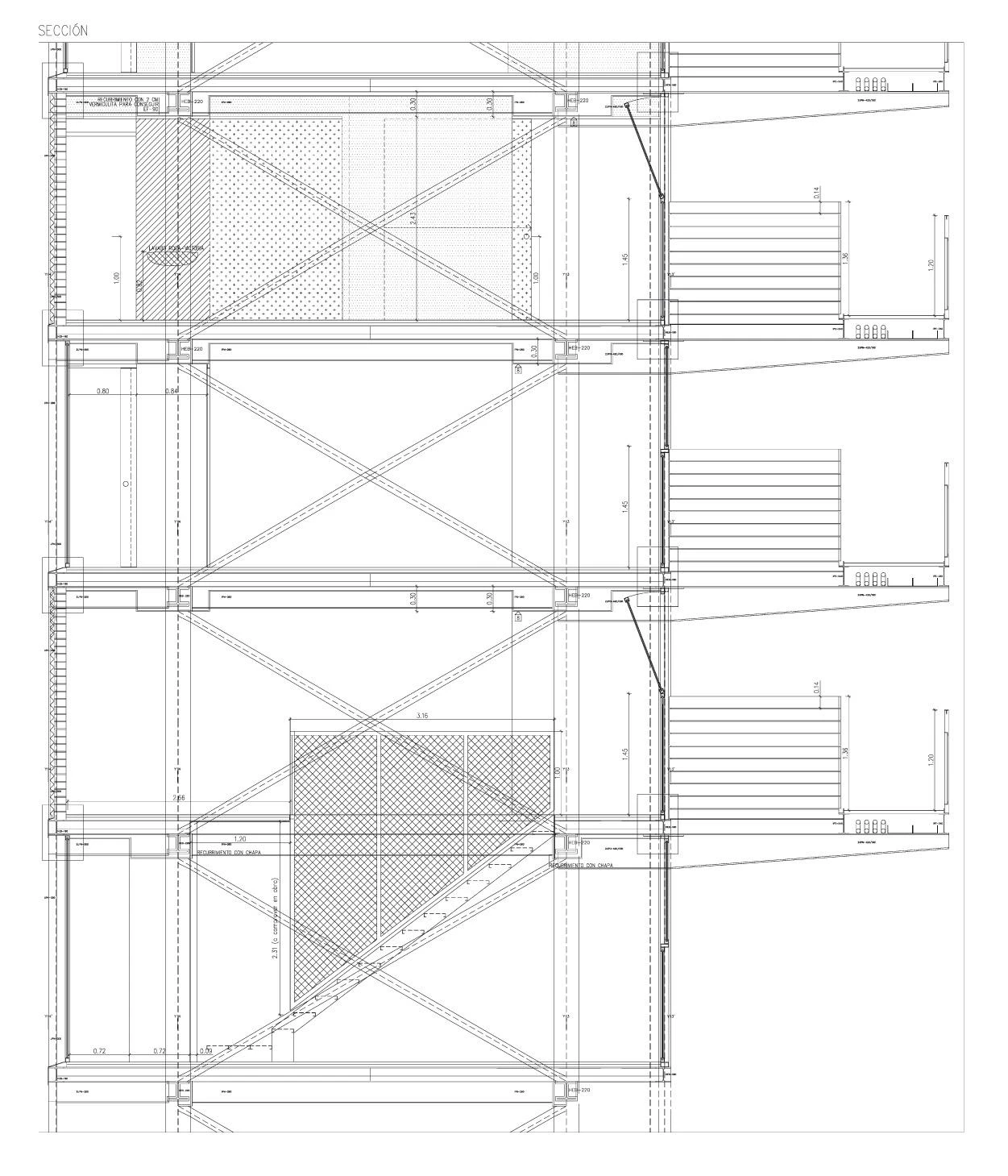 The volume containing the 45 apartments is structured with a metal portico measuring 7,5 meters deep, ensuring cross-ventilation and natural illumination. Access to the dwellings is through cantilevered balconies linked by footbridges that are suspended over the central corridor, which performs as a collective space of interaction.
