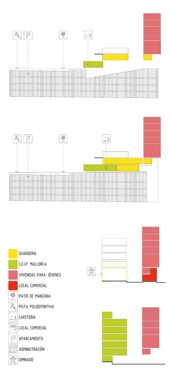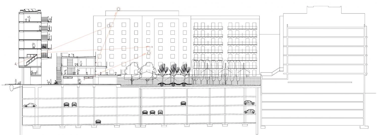 The proposal looks beyond the configuration of the site and penetrates the urban block to create a courtyard that welcomes different uses and includes spaces for sports and for interaction among neighbors.