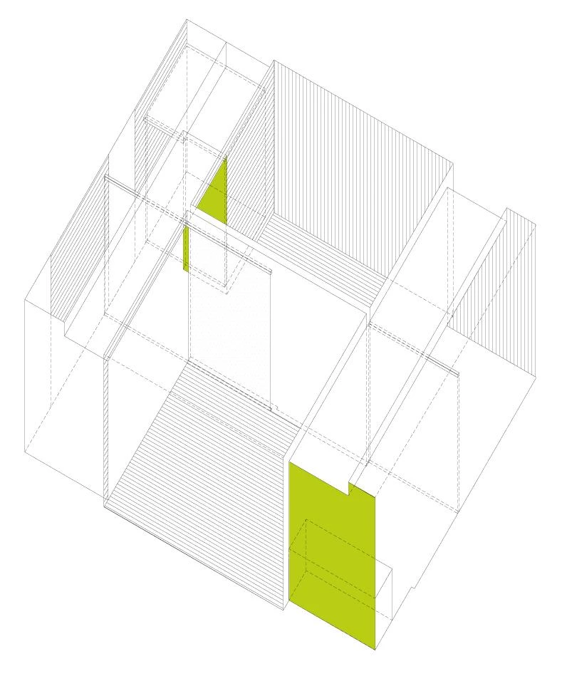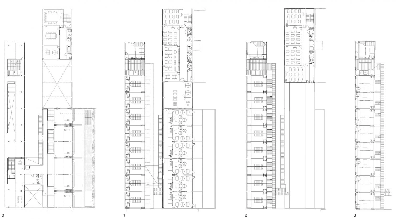 The program is divided into two narrow and parallel volumes, one set back with respect to the other, which occupy a total depth of 28.5 meters. This positioning permits a better use of natural light, generating between the volumes a corridor that helps to organize the spaces and makes the different functions foreseen in the program compatible..