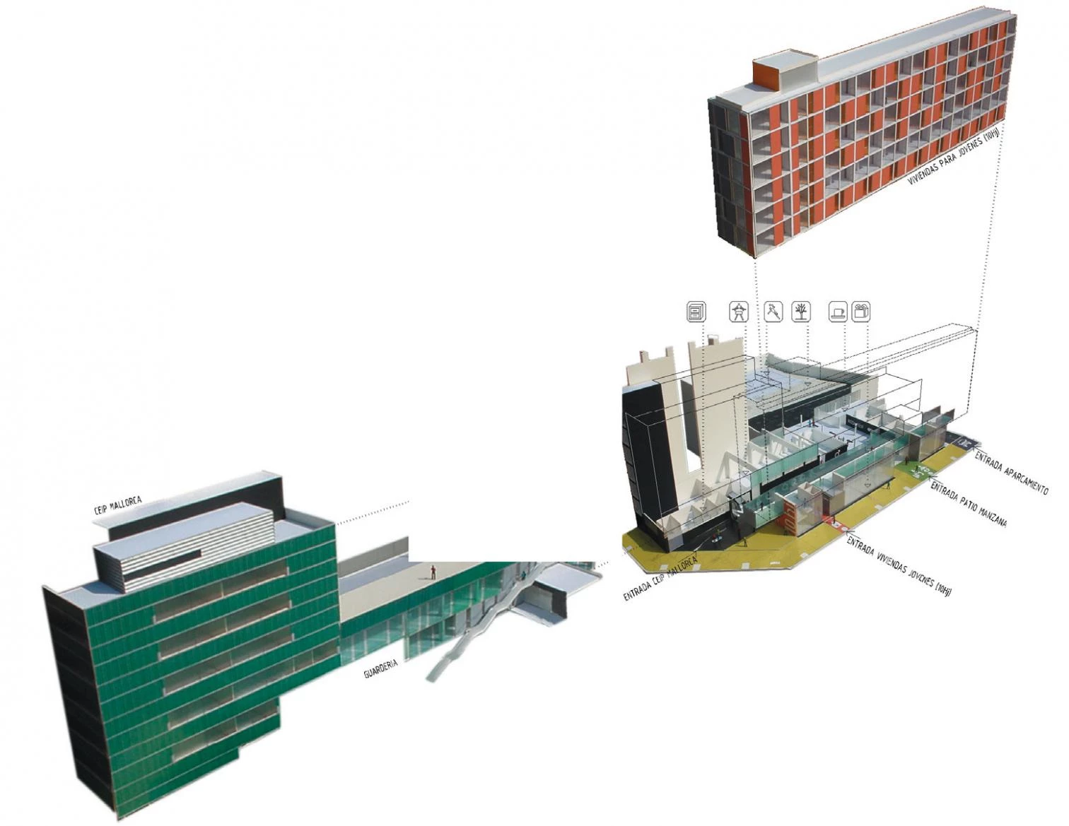 The interior void accommodates a mixed program of housing for young adults, kindergarten and primary school, aside from recovering the block courtyard. The purpose of this new organization is to solve two matters that have to do with the circulation flows – the width of the sidewalks and the separation between pedestrians and vehicles –, and which were not taken into account yet in the urban plan drawn up in the 19th century.
