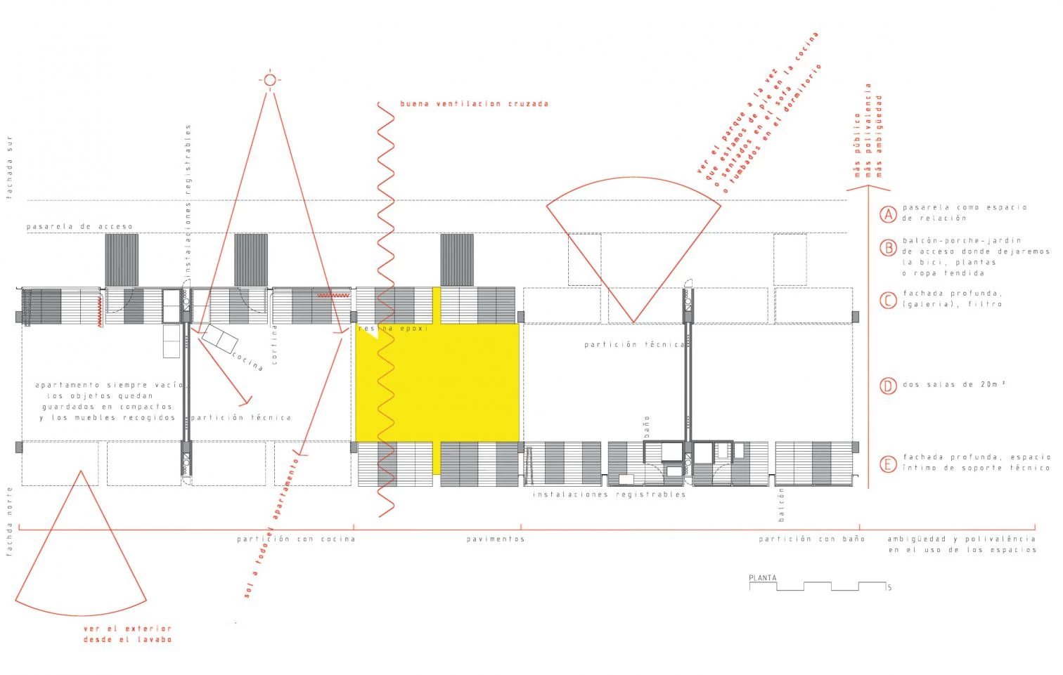 The dwellings are conceived as a series of strata that regulate the degrees of privacy for the residents of the dwellings, creating filters that separate the spaces for socialization from the more private ones.