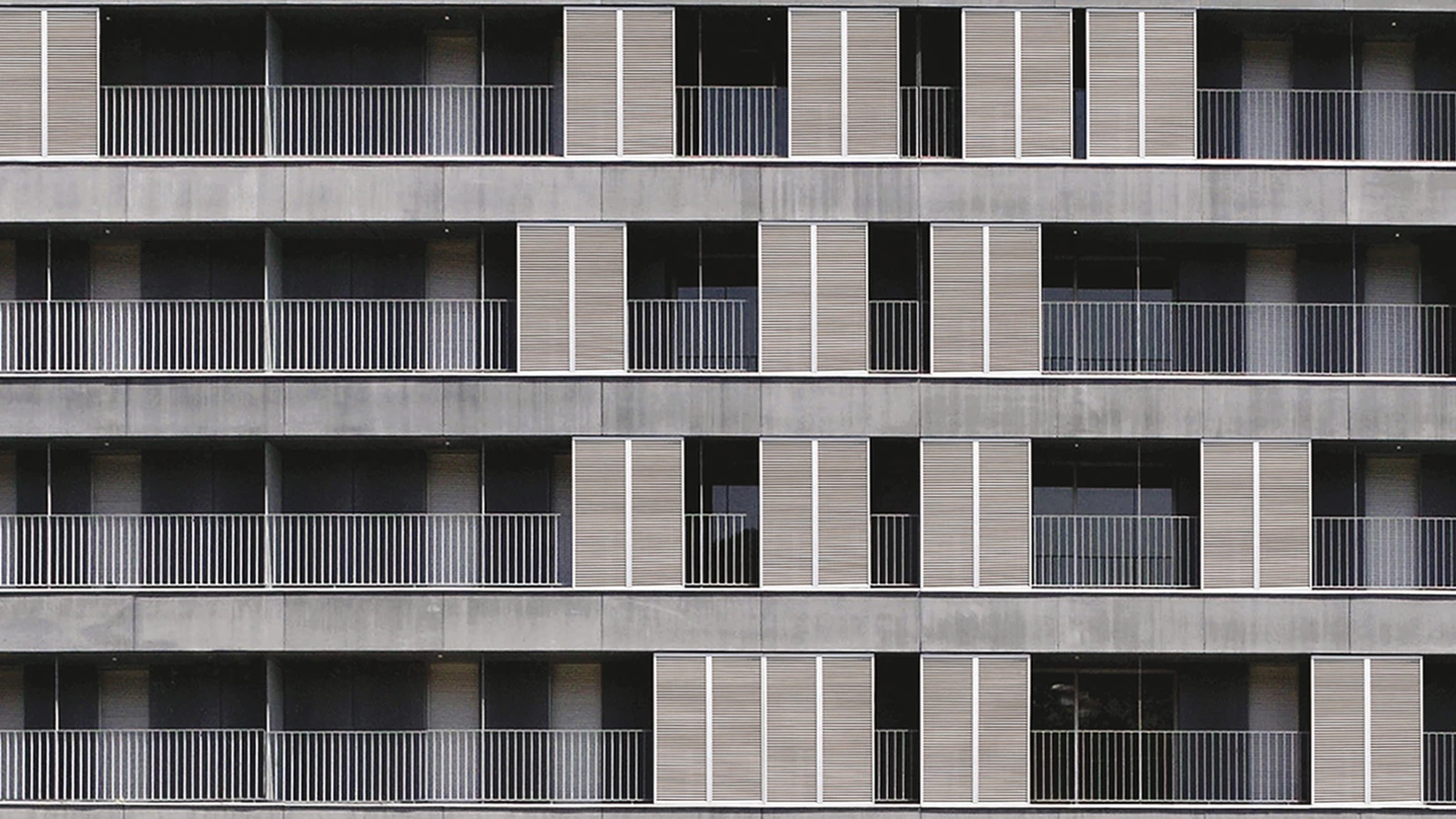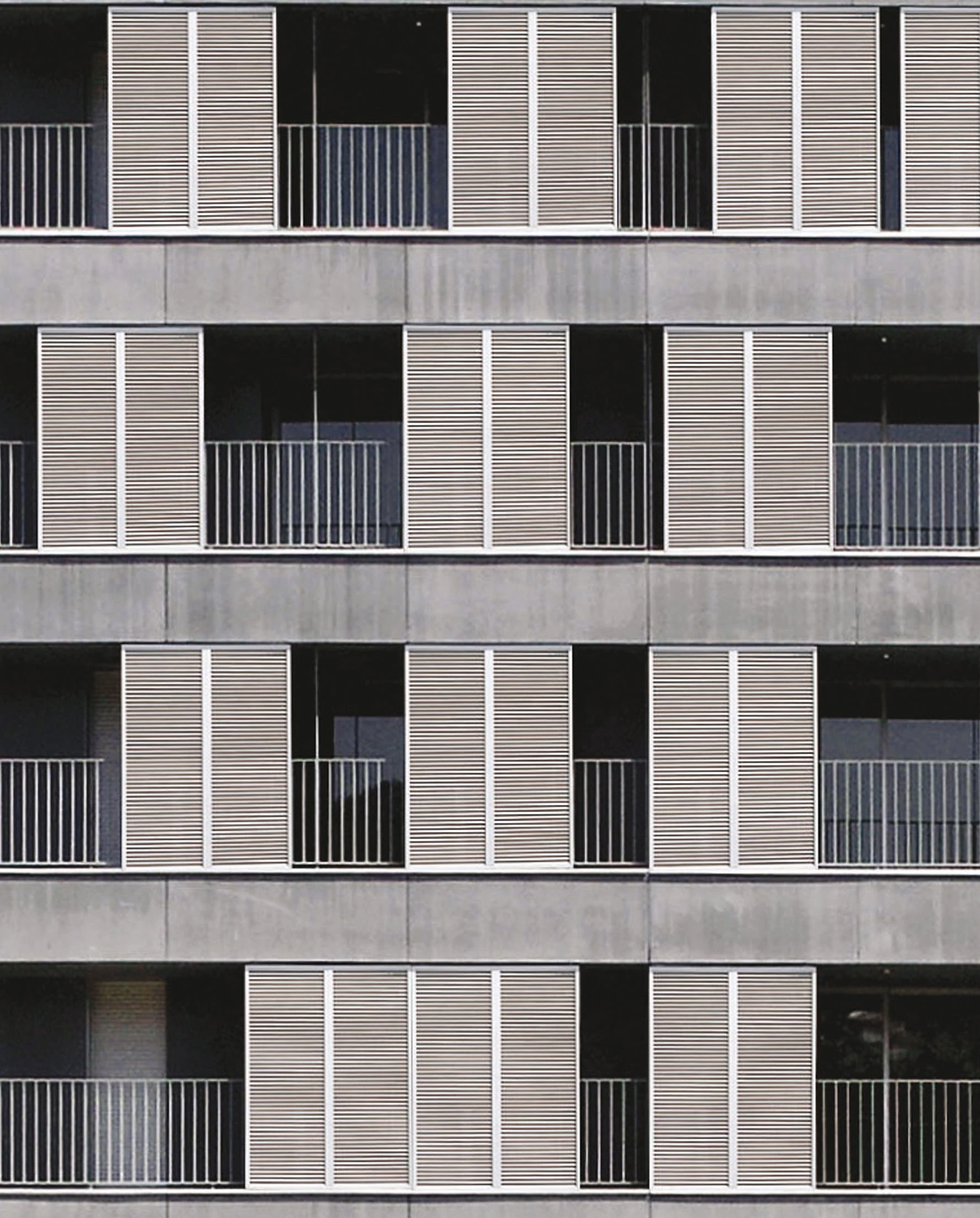 A ventilated facade, with an interior sheet of brick and an exterior one of prefab cement, silica and fiber panels wraps the window-less areas. The openings appear behind a continuous balcony with horizontal aluminum slats.