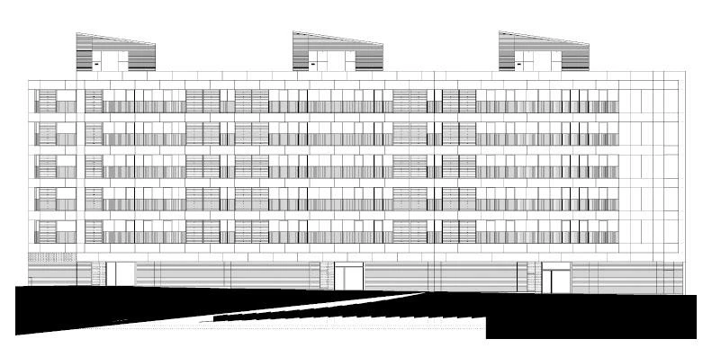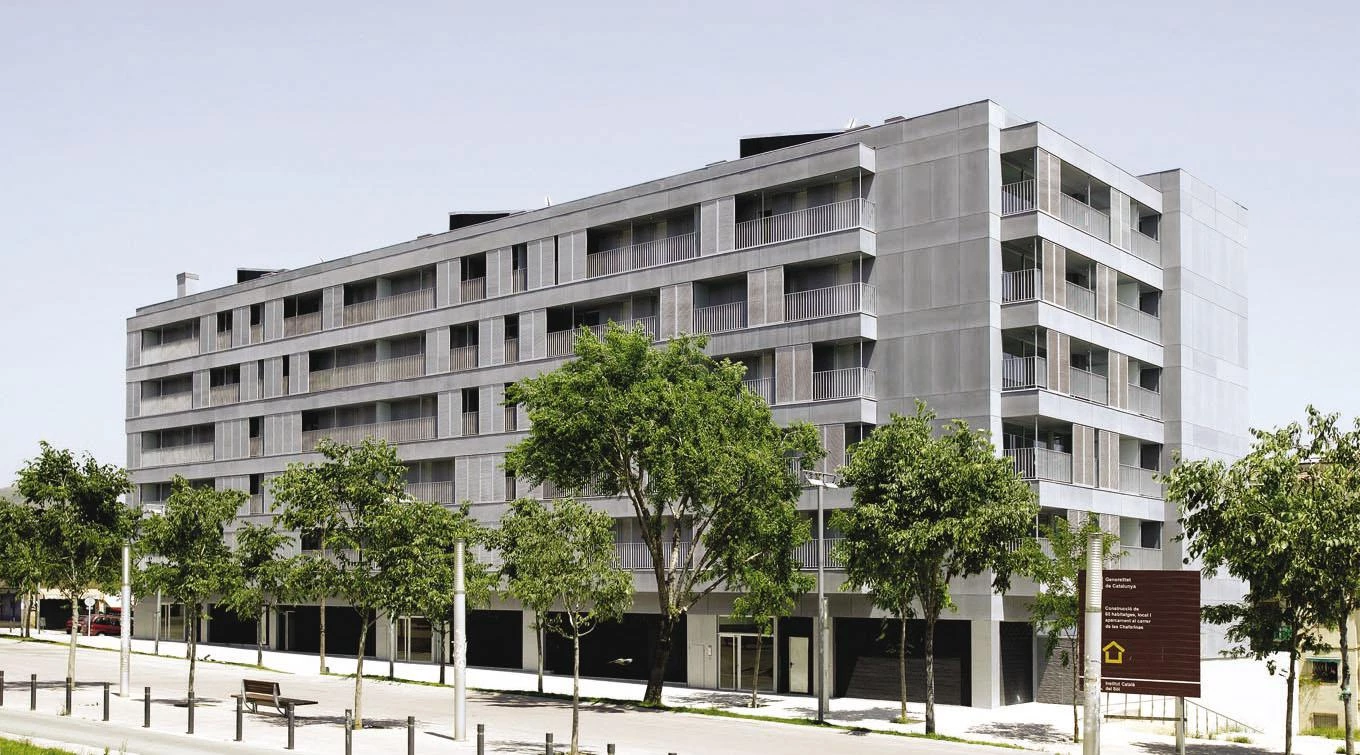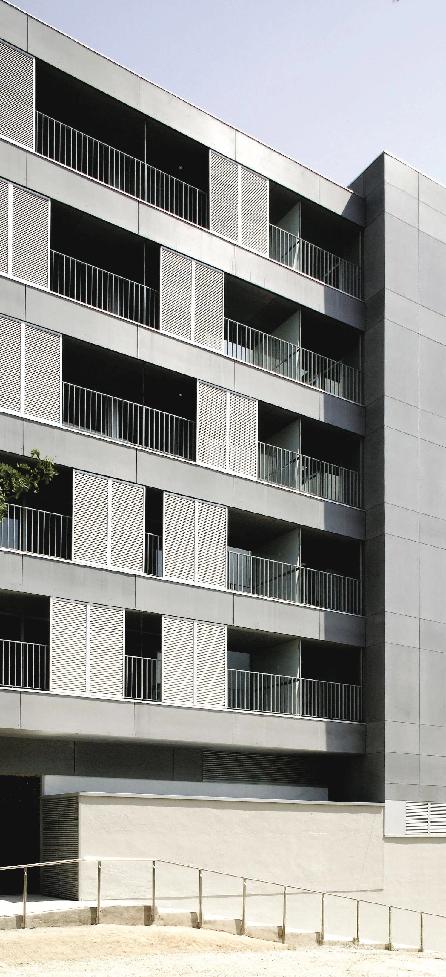 Within the program for the renovation of Trinitat Nova neighborhood, a decaying area northeast of Barcelona, the Catalan institute for land development decided to increase the number of residential units with a total of 249 state-subsidized houses, to be developed in two consecutive phases. The first of them places in a corner plot, located in the area of the neighborhood where the urban fabric is more consolidated, a five story block that houses sixty dwellings and as many parking spots, aside from six shops; the second one has three towers and an elongated prism in a higher, and not so dense area of the district, aiming to generate a physical limit between the city and the mountain and to provide an exit toward the sierra of Collserola. While the 189 dwellings which compose this second phase are still under construction, the building that constitutes the first one has been recently concluded.