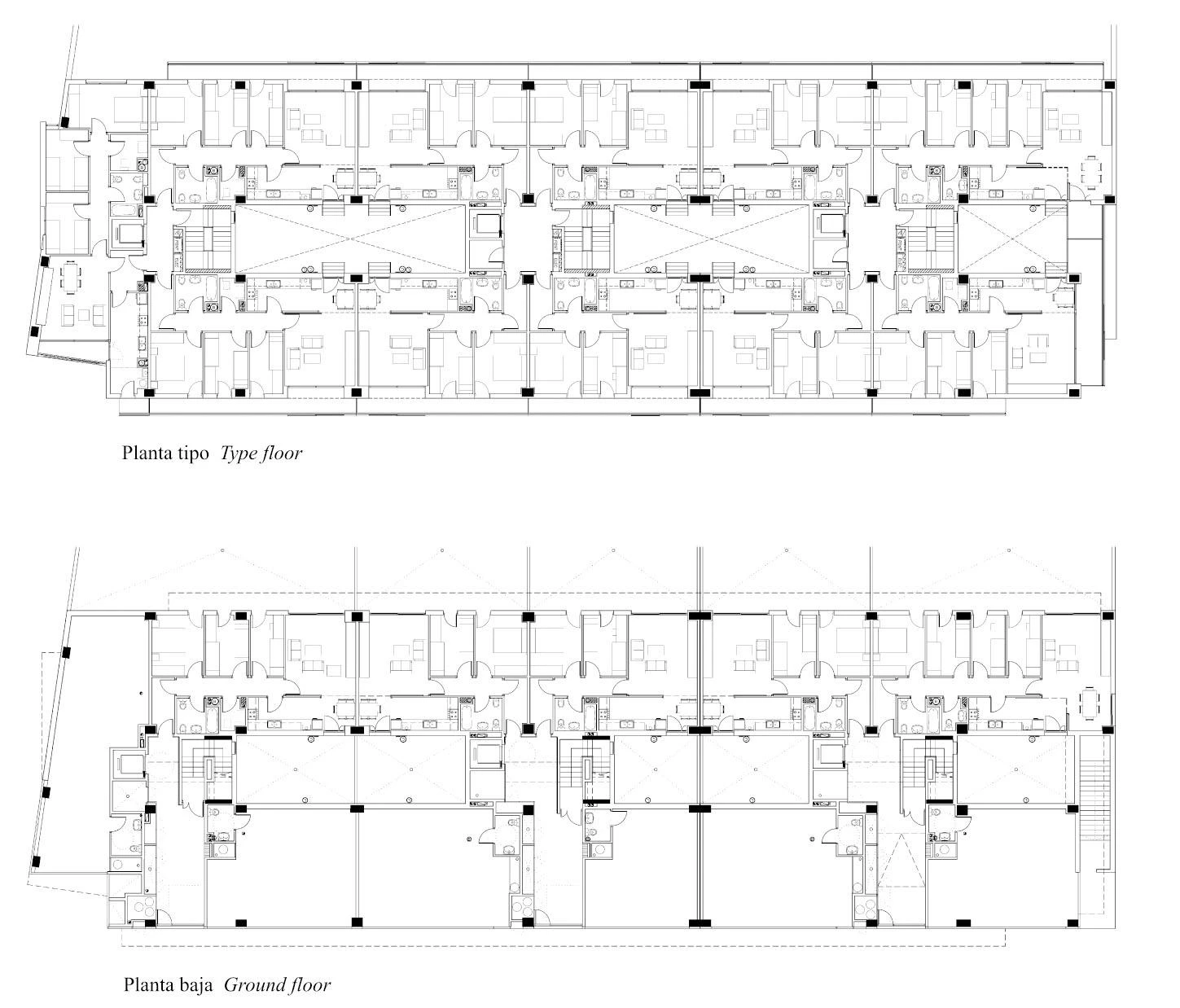Parallel to Chafarinas street, the block has three accesses through entrance halls connected with the courtyards. The parking lot, housed in a concrete plinth that spans the unevenness of the plot, is reached from two pedestrian entrances and a ramp in the rear, which will be a green area. Arranged in two bands of north-south orientation, the dwellings are designed to accommodate 4,5 and 6 persons, including units adapted for the physically disabled. The kitchen and services are aligned in a central bay that includes the three courtyards, while the living areas and bedrooms take up the two outer bands. Only the prism’s side walls break the established order: on the south side the hall rotates pursuing the best orientation; in the north flank, the windows are opened only when necessary.