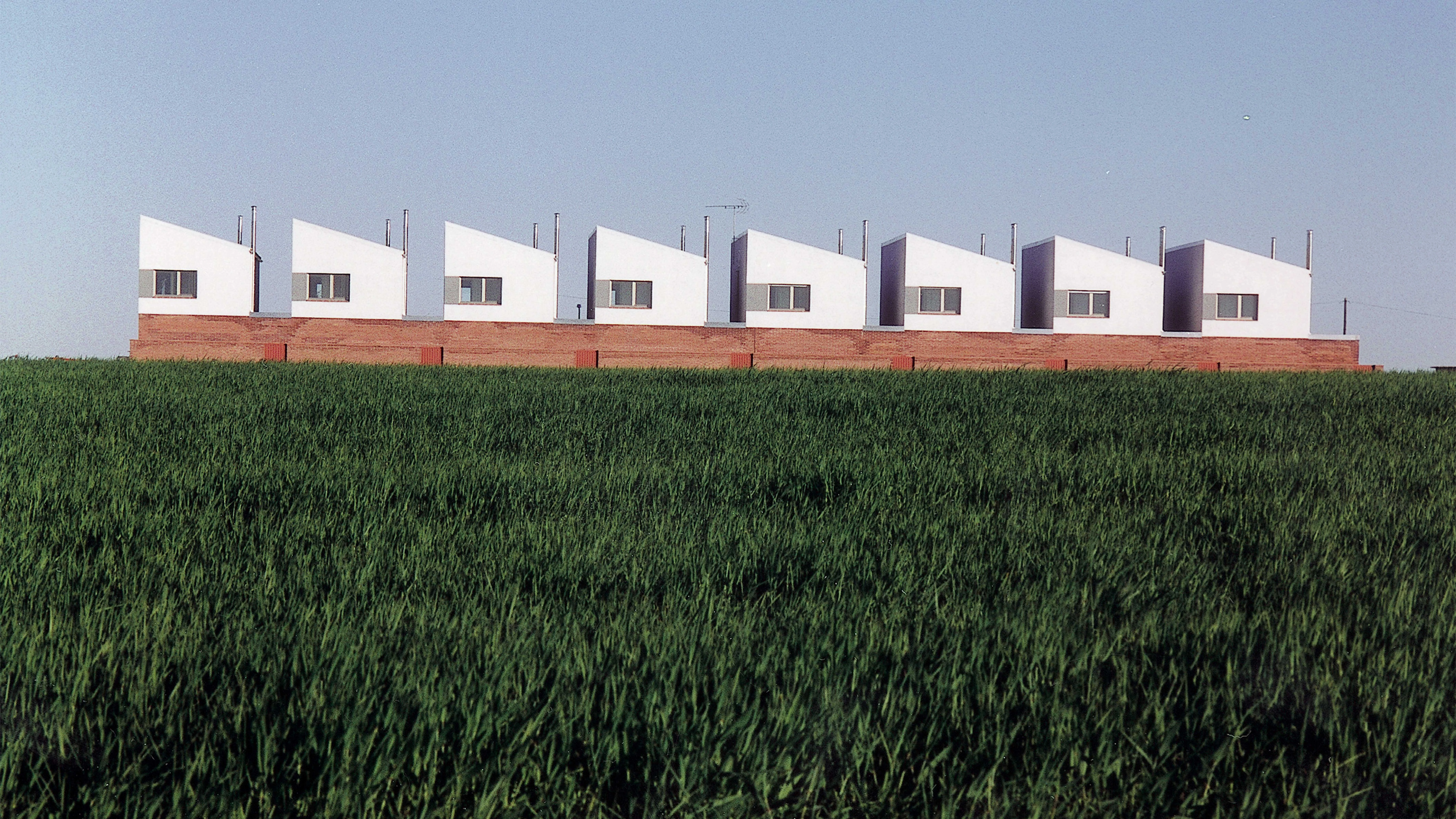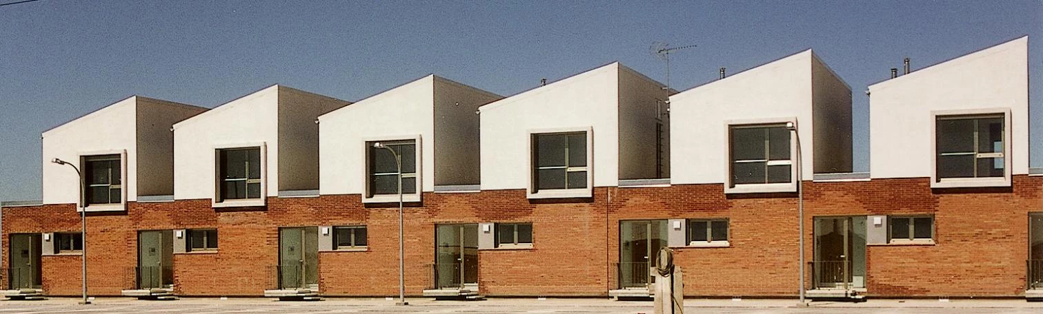 Two parallel rows, only the longer one of which has so far been carried out, flaunt their ties with the land through an earthy-looking plinth. Over this, a series of isolated pieces use the double scale to transmit a unique and necessarily austere image. Through an orderly repetition of the building elements typifying rural nuclei, the project explores the expressive capacity of basic shapes and modest materials. Eight attached two-story houses give shape to the rigorous directives of public housing developments. The building aligns itself with the parcel’s longitudinal border, where the entrances are situated. To concentrate open space at the opposite end and thereby give it a greater breadth, the circulation elements are placed along the party walls. This pushes the bulk of the program to the rear of the lot. Without trying to reflect the sizes of the spaces situated behind them, the elevations are composed from afar. The large windows of the rooms over the entrances, or the gray bands that contain the more modest apertures looking out to the fields, defy the small scale of the project by engaging in a dialogue with the territory.