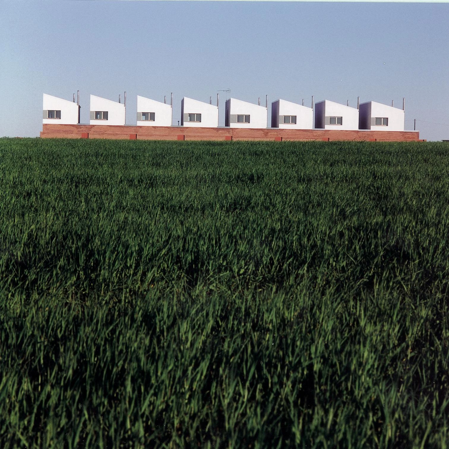 The program is formalized in a disciplined row of houses which face an agricultural skyline. A brick plinth unifies the different volumes, whose archetypal image is completed with picture book chimneys.