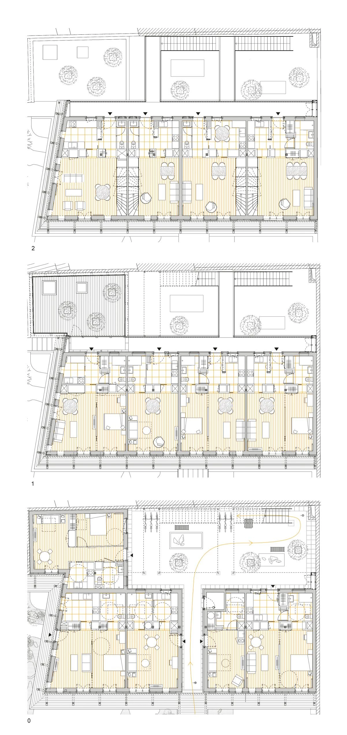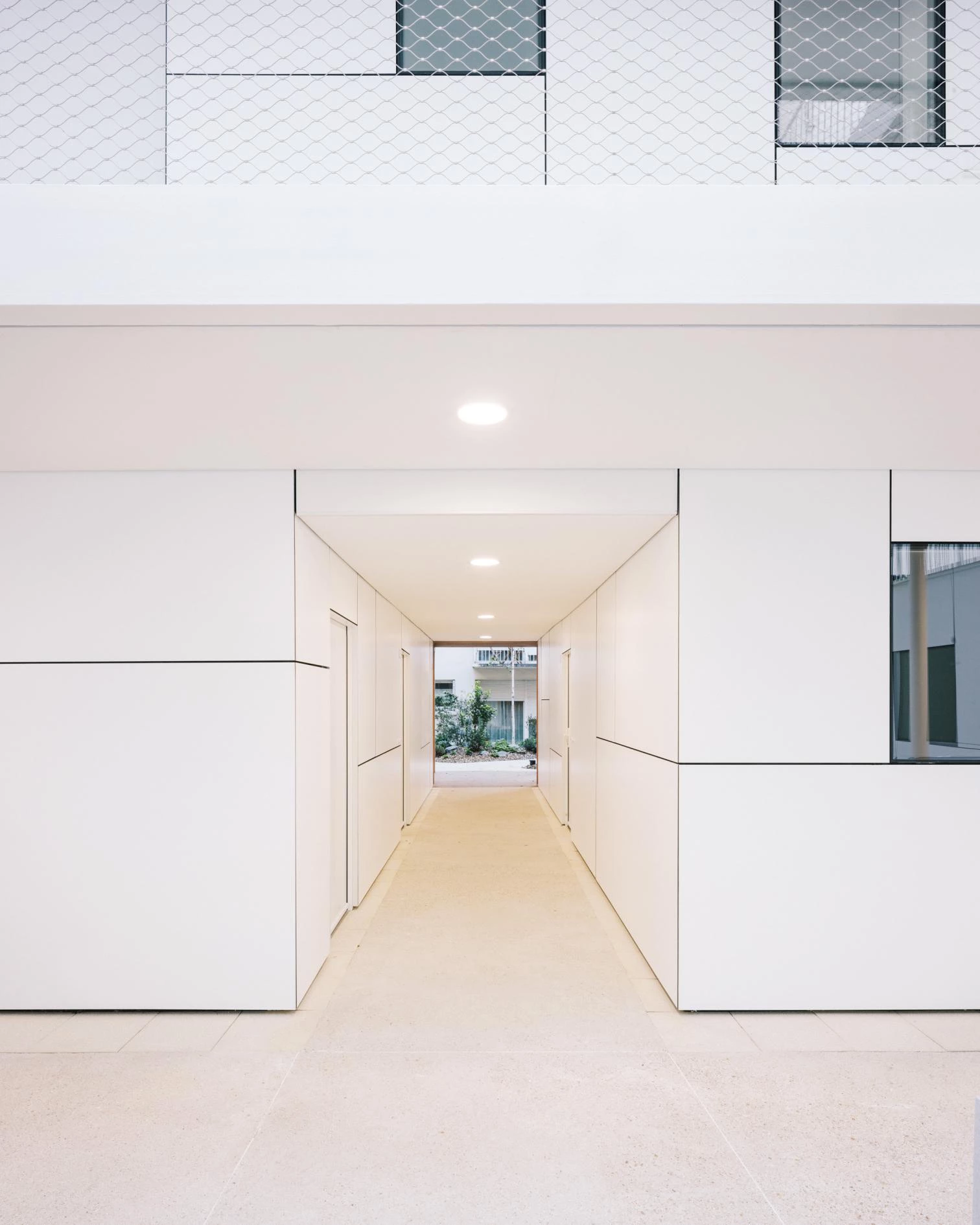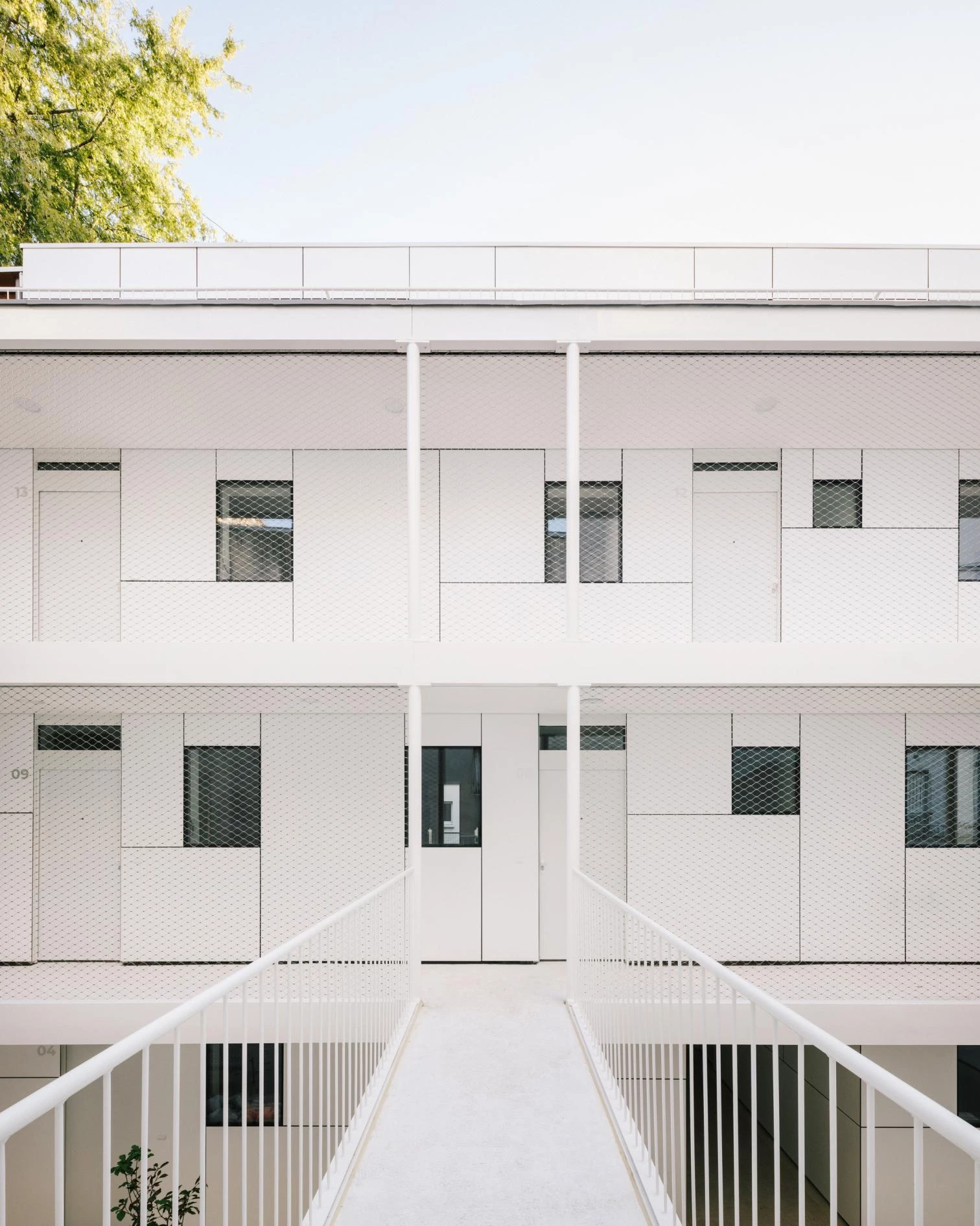 Behind the plant mass of the entrance, the block is organized through an open gallery strategy that makes it possible to design a run-through plan configuration for all flats systematically, allowing space expansion, corridor clearance, and effective natural ventilation.