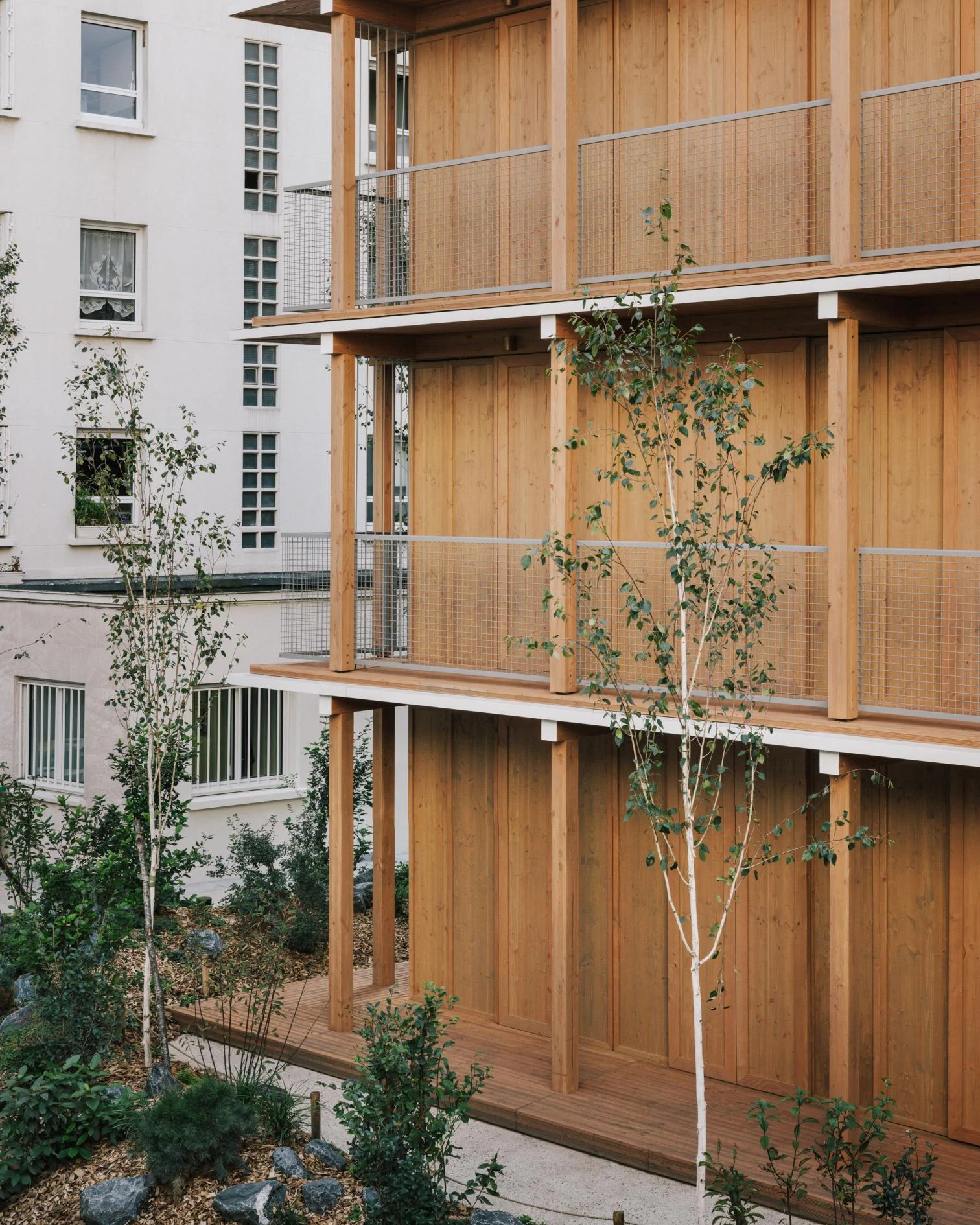 The block, separated from the street by an eleven-story building, faces the restrictions of the site and addresses the environmental commitments of cities today with a wooden structure that reconciles technological innovation and aesthetics.