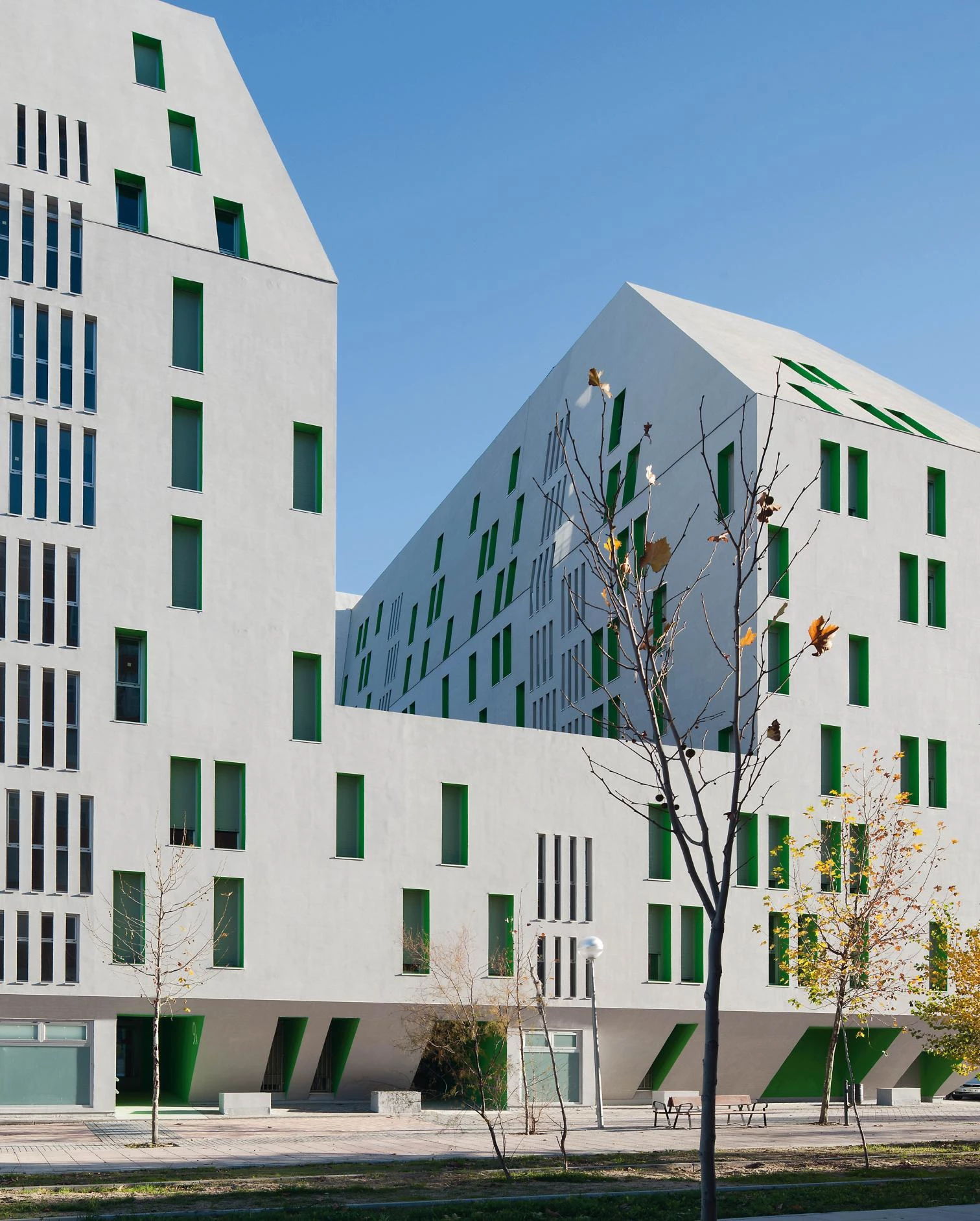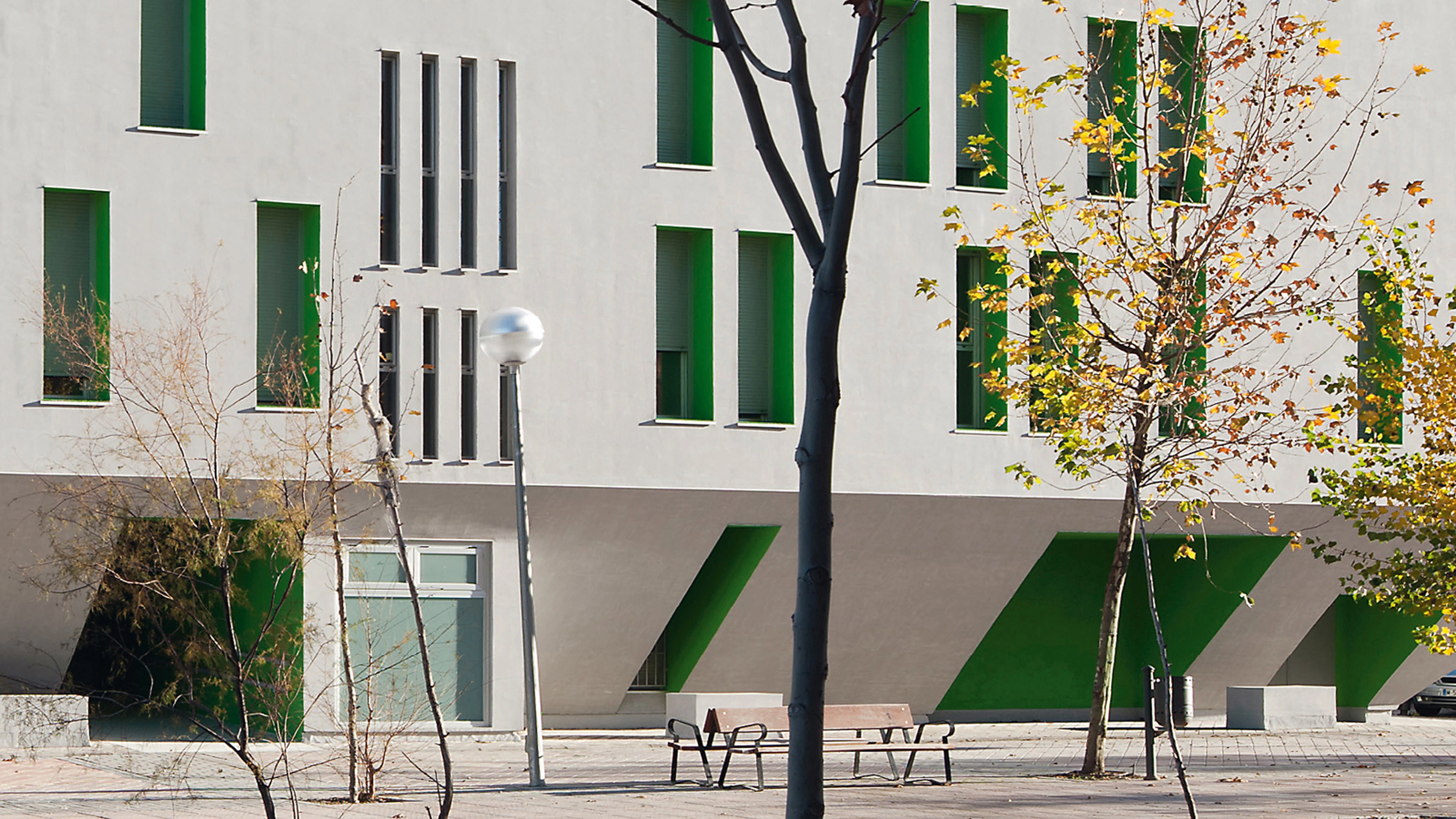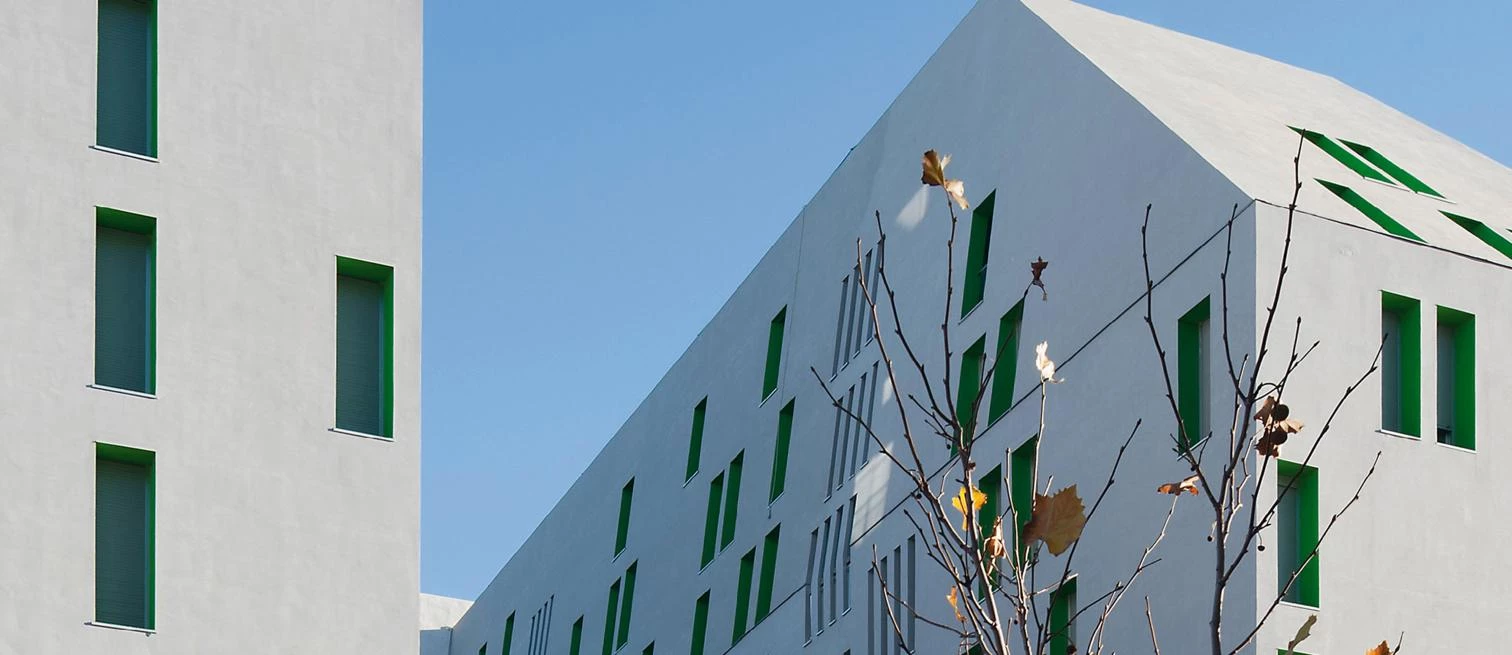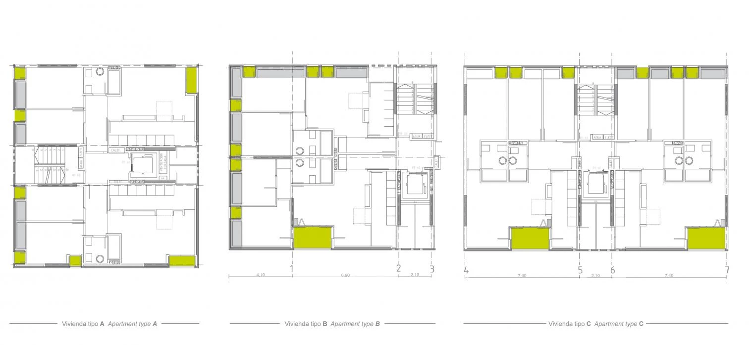 The windows, designed to improve interior thermal comfort, serve as an organizing element in the dwellings. Towards the south, they open up to large balconies that, set back along the facade line, become courtyards for the housing areas of the dwellings, filling them with light and with the green finish of walls and floors – with artificial grass – of the balconies. In the northern orientation the voids become narrower, and the depth of their recesses allows placing wardrobes along the facade, which increase insulation. Thermal behavior of the surface is optimized thanks to the exteriorization of the insulation layer, preserving the mass of the enclosure to increase inertia and avoid thermal breaks. For its part, the structure of screen walls concentrates along the perimeter of the dwelling and in the vertical communication cores, thus guaranteeing layout flexibility. The double orientation of all the apartments, most of them with two and three bedrooms, guarantees cross ventilation and sunning in all the dwelling spaces.