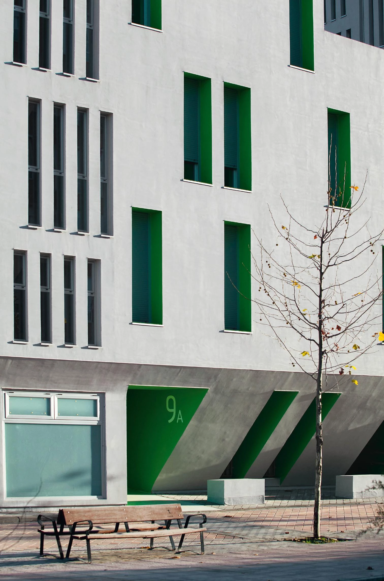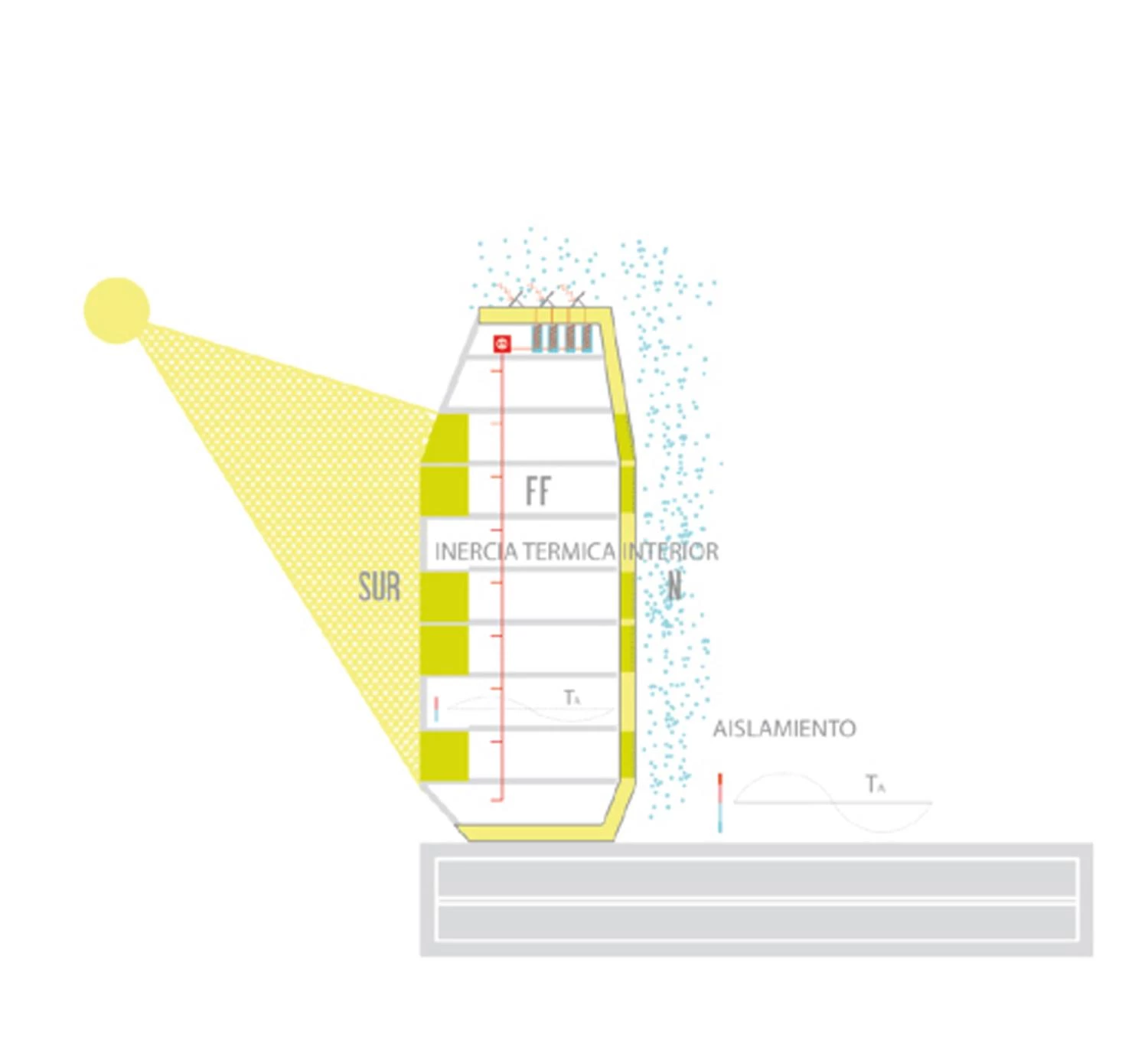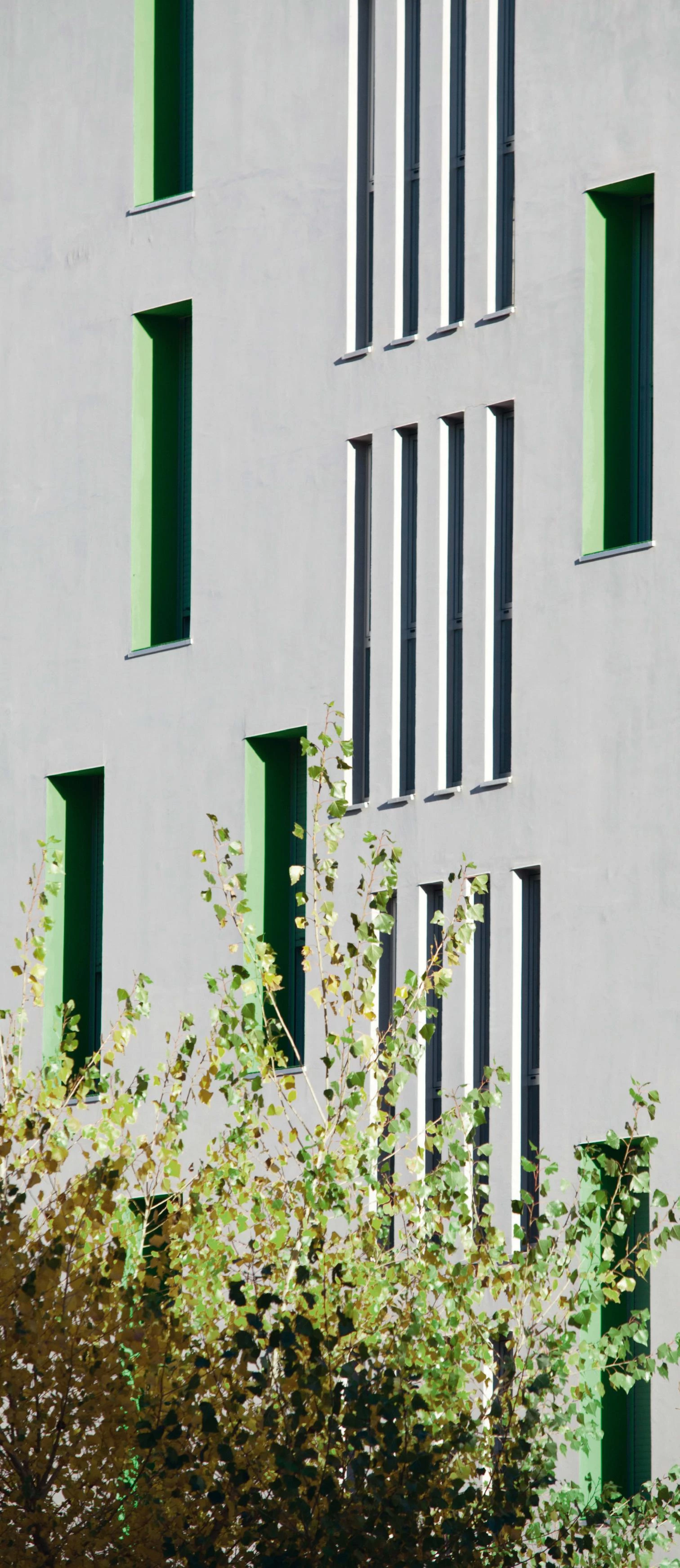 The windows, designed to improve interior thermal comfort, serve as an organizing element in the dwellings. Towards the south, they open up to large balconies that, set back along the facade line, become courtyards for the housing areas of the dwellings, filling them with light and with the green finish of walls and floors – with artificial grass – of the balconies. In the northern orientation the voids become narrower, and the depth of their recesses allows placing wardrobes along the facade, which increase insulation. Thermal behavior of the surface is optimized thanks to the exteriorization of the insulation layer, preserving the mass of the enclosure to increase inertia and avoid thermal breaks. For its part, the structure of screen walls concentrates along the perimeter of the dwelling and in the vertical communication cores, thus guaranteeing layout flexibility. The double orientation of all the apartments, most of them with two and three bedrooms, guarantees cross ventilation and sunning in all the dwelling spaces.
