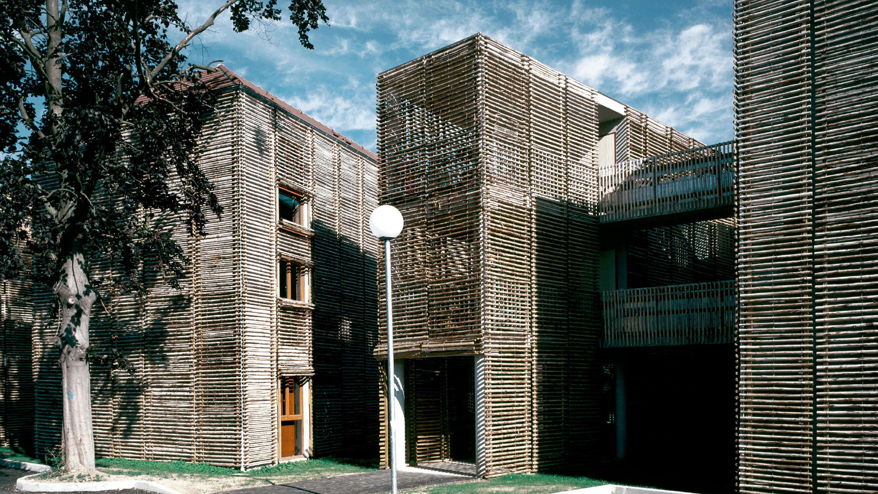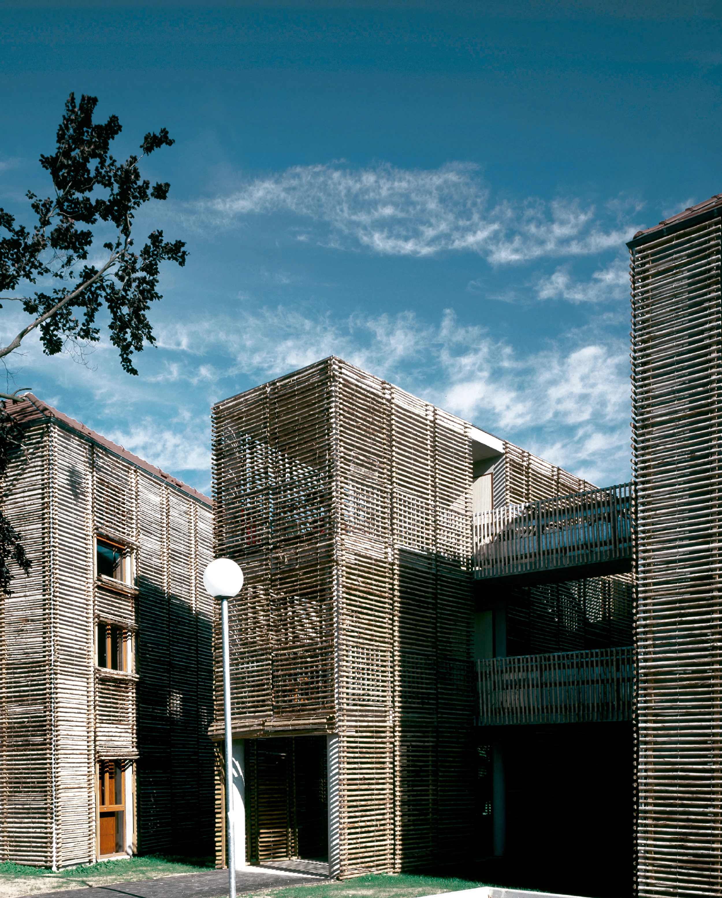 The materials used, all recyclable, are traditional in the area – brick, wood and tile. The load-bearing facade is of exposed brick towards the interior, with a special treatment for the joints to prevent heat loss, and is waterproof towards the exterior. Separated some 20 centimeters from the wall and attached to it by metal anchorages, a second skin of chestnut wood strips protects from sun exposure, rain and wind. The project addresses the fourteen points established by the French HQE (High Environmental Quality)... [+]