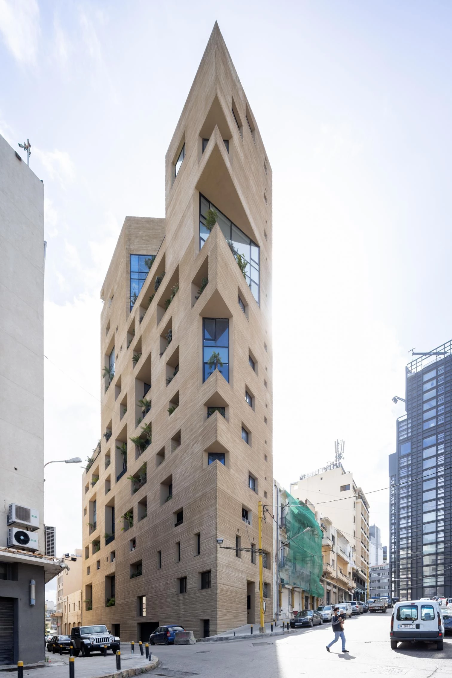 An unscathed survivor of the devastating explosion that befell the nearby Port of Beirut, the sculptural block contains apartments which are laid out differently but all endowed with a garden terrace.