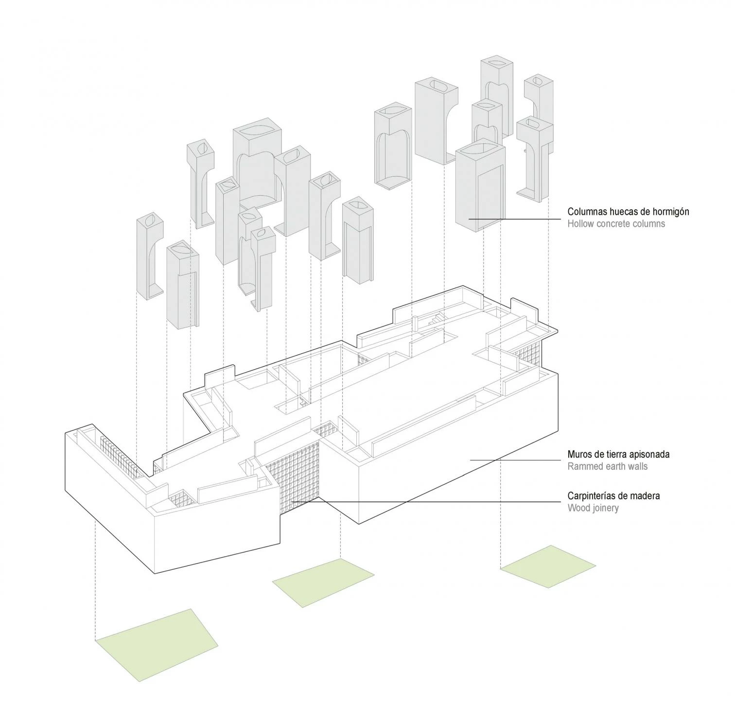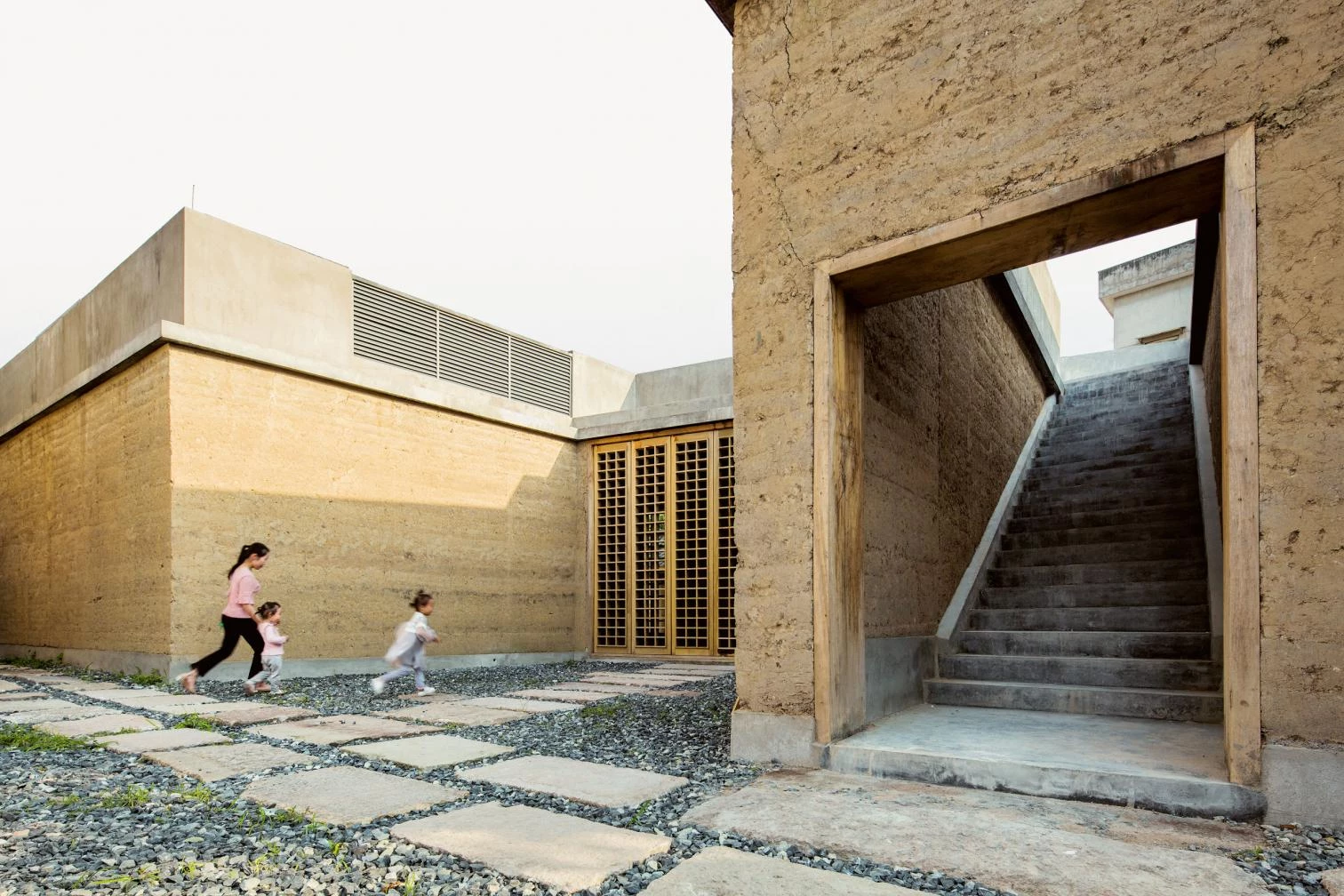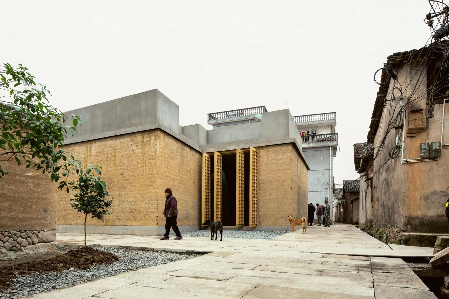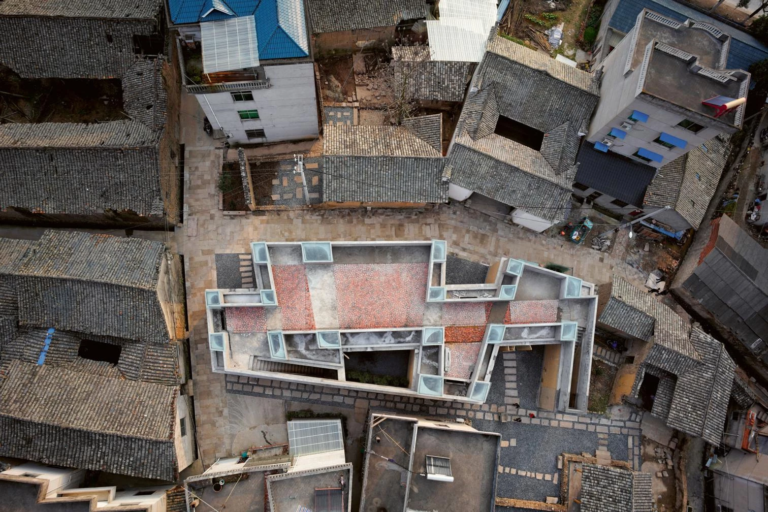 Two different strategies are deployed in order to blend the project into its context. The design starts out by dividing the building into multiple volumes fitting in with the existing village fabric, consisting mainly of three- and four-story buildings. The second strategy is based on the use of materials and construction techniques similar to those of the architecture around. Built with rammed earth walls, the pavilion contains seventeen hollow concrete columns crowned by skylights and decorated with stone niches with relief sculptures representing key moments in Wang Jing’s life. The walkable rooftop becomes a multipurpose space for a variety of activities and provides a raised platform for open views of the surroundings.